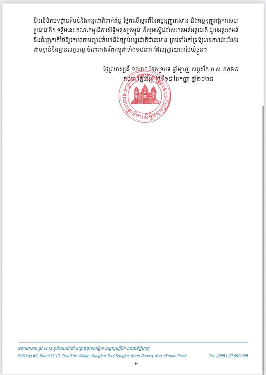 ទន្ទឹមនេះ គណៈកម្មាធិការសិទ្ធិមនុស្សកម្ពុជា ក៏សូមស្នើដល់សហគមន៍អន្តរជាតិ ជួយអន្តរាគមន៍ និងជំរុញភាគីថៃឱ្យគោរពតាមច្បាប់តំបន់និងច្បាប់អន្តរជាតិជាធរមាន ព្រមទាំងគាំទ្រឱ្យមានការដោះលែង ជាបន្ទាន់ និងគ្មានលក្ខខណ្ឌចំពោះកងទ័ពកម្ពុជាទាំង១៨នាក់ ដែលត្រូវយោធាថៃឃុំខ្លួន៕