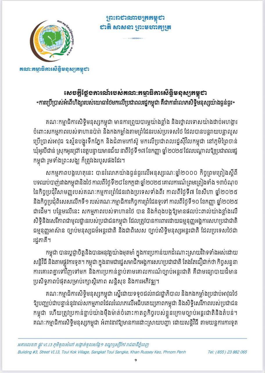 បន្ថែមលើនេះ សកម្មភាពរបស់ទាហានថៃ បាននិងកំពុងបង្កឱ្យមានផលប៉ះពាល់យ៉ាងខ្លាំងលើសិទ្ធិ និងសេរីភាពជាមូលដ្ឋានរបស់ប្រជាជនកម្ពុជា ដែលត្រូវបានការពារដោយធម្មនុញ្ញអង្គការសហប្រជាជាតិ ធម្មនុញ្ញអាស៊ាន ច្បាប់មនុស្សធម៌អន្តរជាតិ និងជាពិសេស ច្បាប់សិទ្ធិមនុស្សអន្តរជាតិ ដែលប្រទេសថៃជារដ្ឋភាគី។