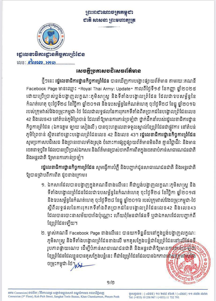រដ្ឋលេខាធិការដ្ឋានកិច្ចការព្រំដែន សូមប្រកាសបដិសេធ និងច្រានចោលទាំងស្រុង ចំពោះការផ្សព្វផ្សាយព័ត៌មានមិនពិត គ្មានវិជ្ជាជីវៈ និងមាន ចេតនាទុច្ចរិត ដែលបានប្រើប្រាស់ឯកសារ និងព័ត៌មានប្រាស់ចាកពីការពិតក្នុងចេតនាបំភាន់សាធារណជនជាតិ និងអន្តរជាតិ ឱ្យមានការភាន់ច្រឡំ។