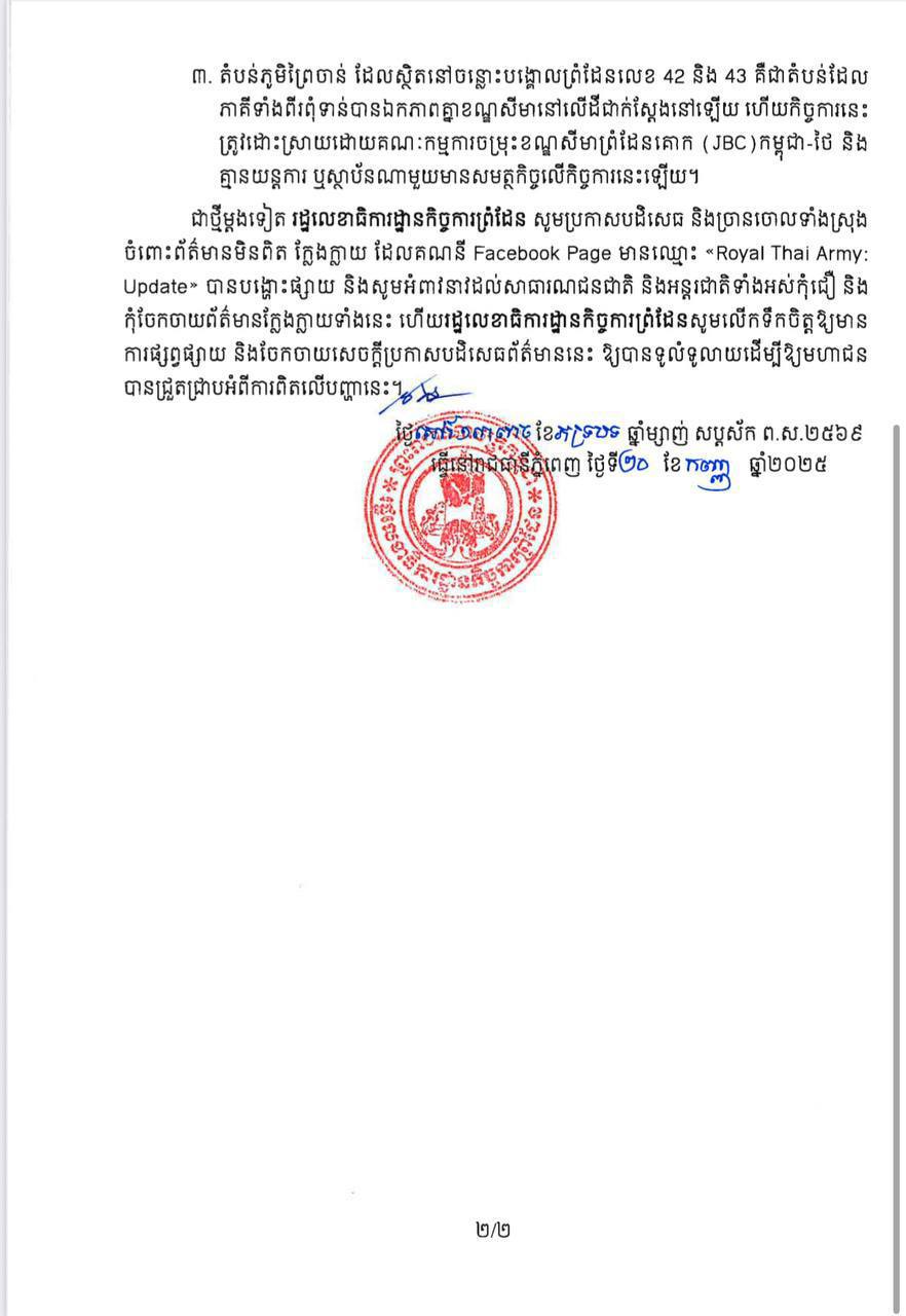 ជាថ្មីម្តងទៀត រដ្ឋលេខាធិការដ្ឋានកិច្ចការព្រំដែន សូមប្រកាសបដិសេធ និងច្រានចោលទាំងស្រុង ចំពោះព័ត៌មានមិនពិត ក្លែងក្លាយ ដែលគណនី Facebook Page មានឈ្មោះ «Royal Thai Army: Update» បានបង្ហោះផ្សាយ និងសូមអំពាវនាវដល់សាធារណជនជាតិ និងអន្តរជាតិទាំងអស់កុំជឿ និងកុំចែកចាយព័ត៌មានក្លែងក្លាយទាំងនេះ ហើយរដ្ឋលេខាធិការដ្ឋានកិច្ចការព្រំដែនសូមលើកទឹកចិត្តឱ្យមាន ការផ្សព្វផ្សាយ និងចែកចាយសេចក្តីប្រកាសបដិសេធព័ត៌មាននេះ ឱ្យបានទូលំទូលាយដើម្បីឱ្យមហាជន បានជ្រួតជ្រាបអំពីការពិតលើបញ្ហានេះ៕