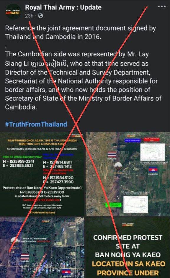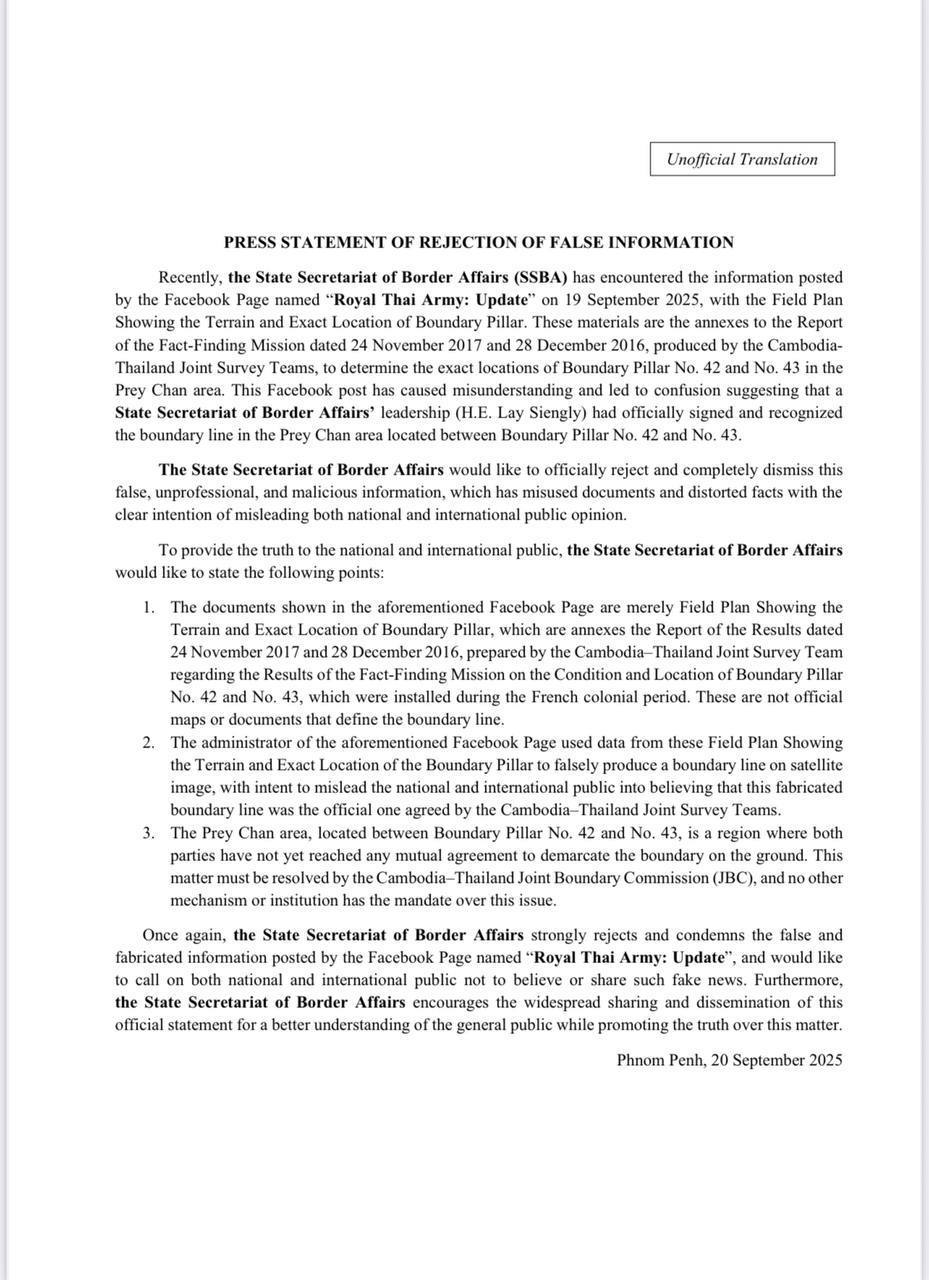 រដ្ឋលេខាធិការដ្ឋានកិច្ចការព្រំដែន បានកក់សម្គាល់ឃើញថា ថ្មីៗនេះបានឃើញការបង្ហោះផ្សាយព័ត៌មាន តាមរយៈគណនី Facebook Page មានឈ្មោះ «Royal Thai Army: Update» កាលពីថ្ងៃទី១៩ ខែកញ្ញា ឆ្នាំ២០២៥ ដោយប្រើប្រាស់ប្លង់បង្ហាញលក្ខណៈភូមិសាស្ត្រ និងទីតាំងបង្គោលព្រំដែន ដែលជាឧបសម្ព័ន្ធនៃ កំណត់ហេតុ ចុះថ្ងៃទី២៤ ខែវិច្ឆិកា ឆ្នាំ២០១៧ និងឧបសម្ព័ន្ធនៃកំណត់ហេតុចុះថ្ងៃទី២៨ ខែធ្នូ ឆ្នាំ២០១៦ របស់ក្រុមវាស់វែងចម្រុះកម្ពុជា-ថៃ ដែលជាលទ្ធផលនៃការរុករកទីតាំងពិតប្រាកដនៃបង្គោលព្រំដែនលេខ ៤២ និងលេខ ៤៣ នៅតំបន់ភូមិព្រៃចាន់ ដែលនាំឱ្យមានការភាន់ច្រឡំថា ថ្នាក់ដឹកនាំរបស់រដ្ឋលេខាធិការដ្ឋានកិច្ចការព្រំដែន (ឯកឧត្តម ឡាយ សៀងលី) បានចុះហត្ថលេខាទទួលស្គាល់ខ្សែព្រំដែនជាផ្លូវការនៅតំបន់ភូមិព្រៃចាន់ ស្ថិតនៅចន្លោះបង្គោលព្រំដែនលេខ ៤២ និងលេខ ៤៣។