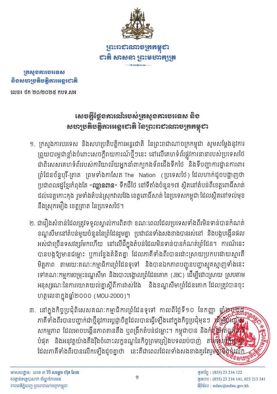 សេចក្តីថ្លែងការណ៍របស់ក្រសួងការបរទេស និងសហប្រតិបត្តិការអន្តរជាតិកម្ពុជា នៅថ្ងៃទី២៥ ខែកញ្ញា នេះ បានបញ្ជាក់ថា កម្ពុជា សូមសម្តែងនូវការព្រួយបារម្ភជាខ្លាំងចំពោះសេចក្តីរាយការណ៍ថ្មីៗនេះ នៅលើគេហទំព័រផ្លូវការនានារបស់ប្រទេសថៃ ជាពិសេសគេហទំព័ររបស់ការិយាល័យអ្នកនាំពាក្យកងទ័ពជើងទឹកថៃ និងទីបញ្ជាការដ្ឋានការពារ ព្រំដែនច័ន្ទបុរី-ត្រាត ព្រមទាំងកាសែត The Nation (ប្រទេសថៃ) ដែលហាក់ដូចបង្ហាញថា ប្រជាពលរដ្ឋខ្មែរកំពុងតែ «ឈ្លានពាន» ទឹកដីថៃ នៅទីតាំងចំនួន ១៧ ស្ថិតនៅតំបន់ពីខេត្តពោធិ៍សាត់ ដល់ខេត្តកោះកុង រួមទាំងតំបន់ស្រុកវាលវែង ខេត្តពោធិ៍សាត់ នៃប្រទេសកម្ពុជា ដែលស្ថិតនៅទល់មុខនឹងស្រុកមឿង ខេត្តត្រាត នៃប្រទេសថៃ។