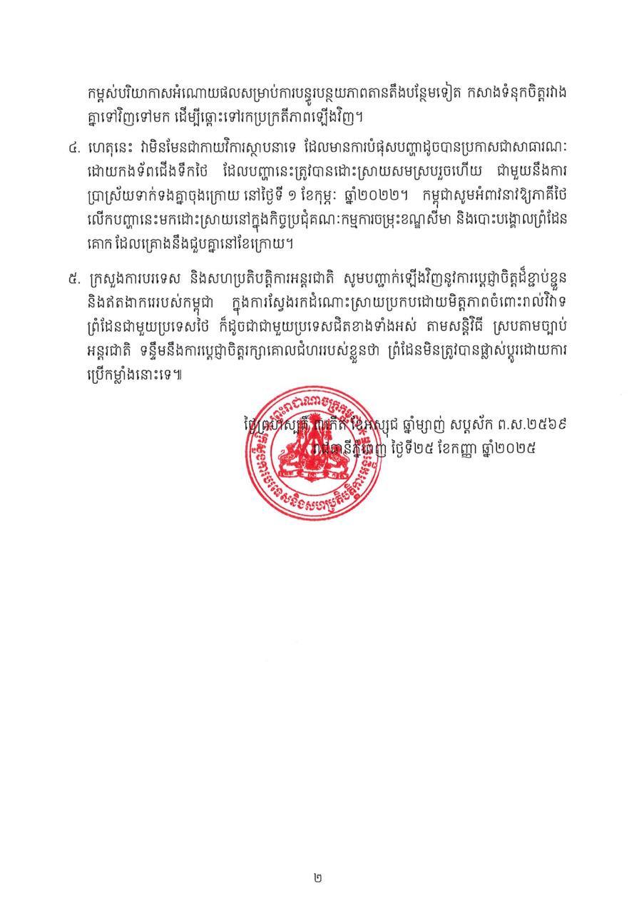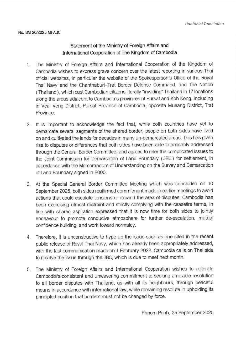 ក្រសួងការបរទេស បានបញ្ជាក់ថា នៅក្នុងកិច្ចប្រជុំពិសេសគណៈកម្មាធិការព្រំដែនទូទៅ កាលពីថ្ងៃទី១០ ខែកញ្ញា ឆ្នាំ២០២៥ ភាគីទាំងពីរបានបញ្ជាក់ជាថ្មីនូវការប្តេជ្ញាចិត្តដែលបានធ្វើឡើងនៅក្នុងកិច្ចប្រជុំមុនៗ សកម្មភាពដែលអាចបង្កើនភាពតានតឹង ឬពង្រីកតំបន់ជម្លោះ។