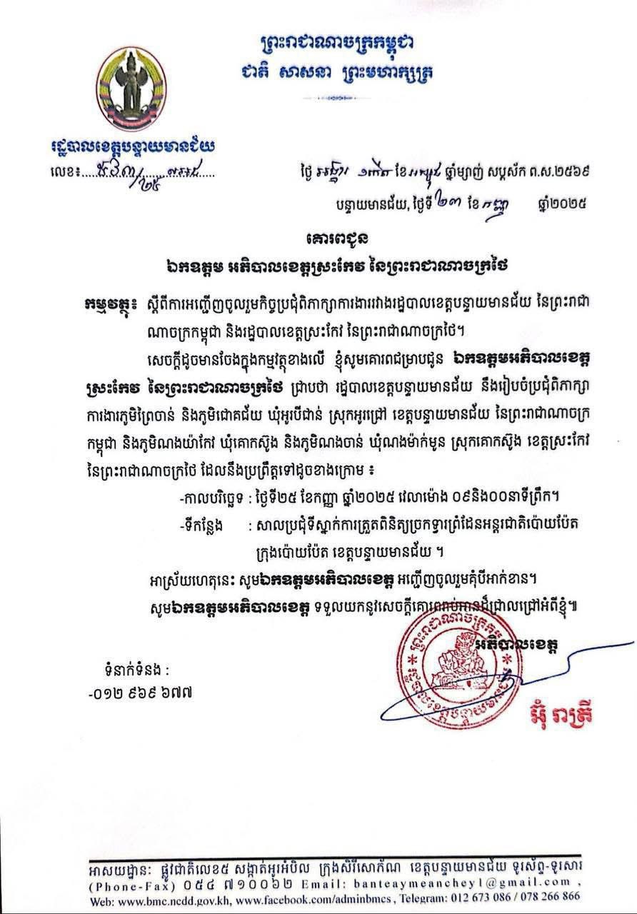 លោកអភិបាលខេត្តបន្ទាយមានជ័យ បានរំឭកឡើងវិញនូវគោលការណ៍ ចំនួន ៤ ចំណុច ដូចដែលបានលើកឡើងជូនអភិបាលខេត្តស្រះកែវ កាលពីថ្ងៃទី១៨ ខែកញ្ញា ឆ្នាំ២០២៥ និងស្នើភាគីថៃយកចិត្តទុកដាក់អនុវត្តគោលការណ៍ទាំងនេះឱ្យបានពេញលេញ និងខ្ជាប់ខ្ជួន។