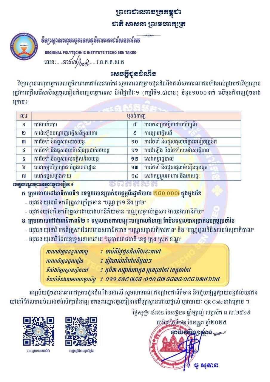 តាកែវ៖ វិទ្យាស្ថានពហុបច្ចេកទេសភូមិភាគតេជោសែនតាកែវ នៃក្រសួងការងារ និងបណ្តុះបណ្តលវិជ្ជាជីវៈ ផ្តល់អាហារូបករណ៍ ចំនួន ១ ០០០ កន្លែង លើ ១៤ មុខជំនាញ ដល់យុវជនមកពីគ្រួសារក្រីក្រ និងគ្រួសារងាយរងហានិភ័យ ព្រមទាំងផ្ដល់ប្រាក់ឧបត្ថម្ភប្រចាំខែក្រោមកម្មវិធីបណ្តុះបណ្តាលជំនាញវិជ្ជាជីវៈ និងបច្ចេកទេសដល់យុវជនមកពីគ្រួសារក្រីក្រ និងគ្រួសារងាយរងហានិភ័យ (TVET 1.5M)។
