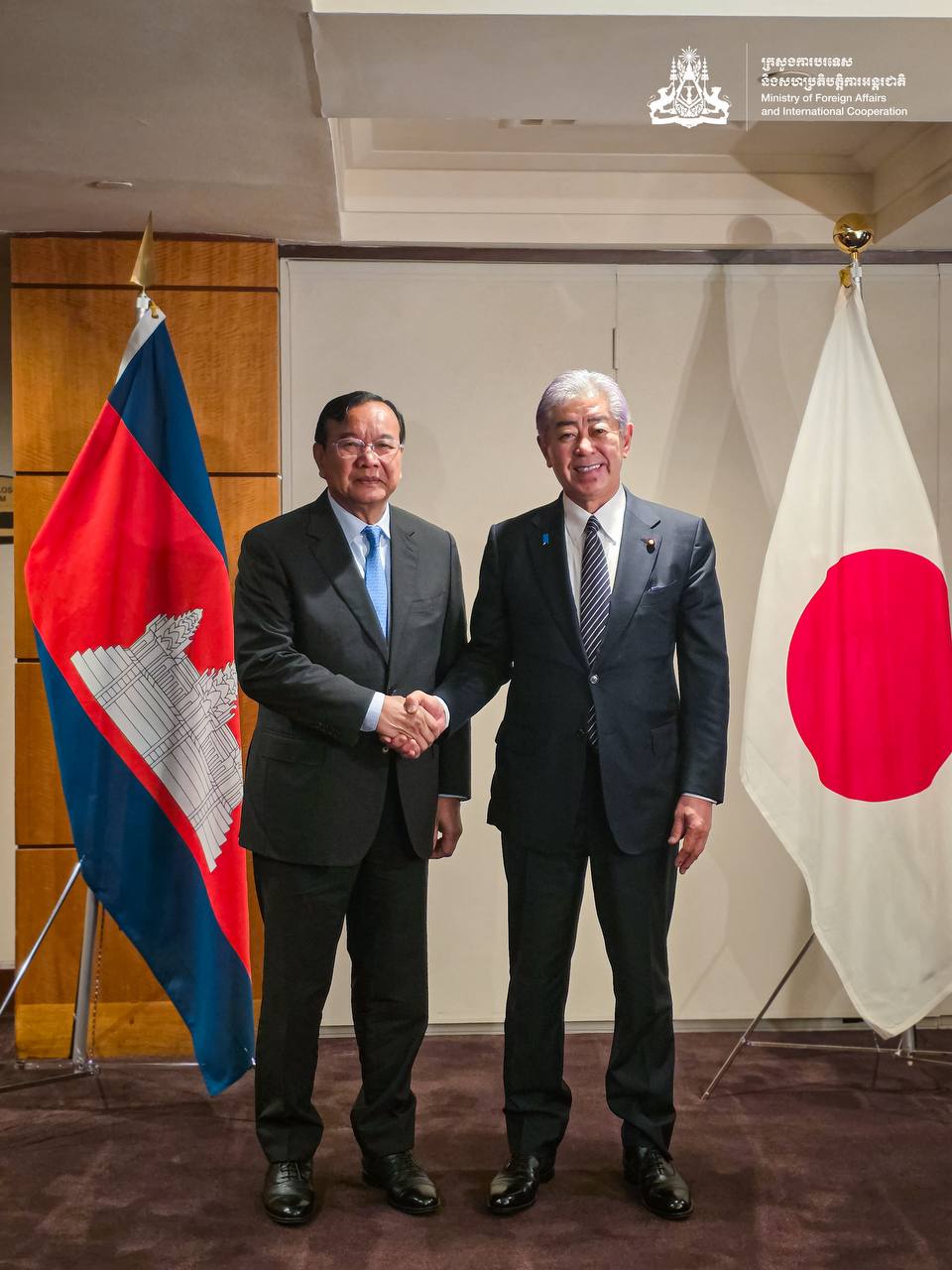 នាឱកានោះ រដ្ឋមន្ត្រីការបរទេសទាំងពីរមានសេចក្ដីរីករាយដែលបានជួបគ្នាសារជាថ្មី និងបានឆ្លៀតឱកាសផ្តាំផ្ញើការសួរសុខទុក្ខយ៉ាងកក់ក្តៅពីគ្នាទៅវិញទៅមក បន្ទាប់ពីជំនួបប្រកបដោយផ្លែផ្កាកន្លងទៅចំនួនពីរ ក្នុងដំណើរទស្សនកិច្ចផ្លូវការរបស់ សម្តេចមហាបវរធិបតី ហ៊ុន ម៉ាណែត នៅប្រទេសជប៉ុន កាលពីខែឧសភា ឆ្នាំ២០២៥ និងក្នុងកិច្ចប្រជុំរដ្ឋមន្ត្រីការបរទេសអាស៊ាន លើកទី៥៨ និងកិច្ចប្រជុំពាក់ព័ន្ធ នៅទីក្រុងគូឡាឡាំពួ ប្រទេសម៉ាឡេស៊ី។