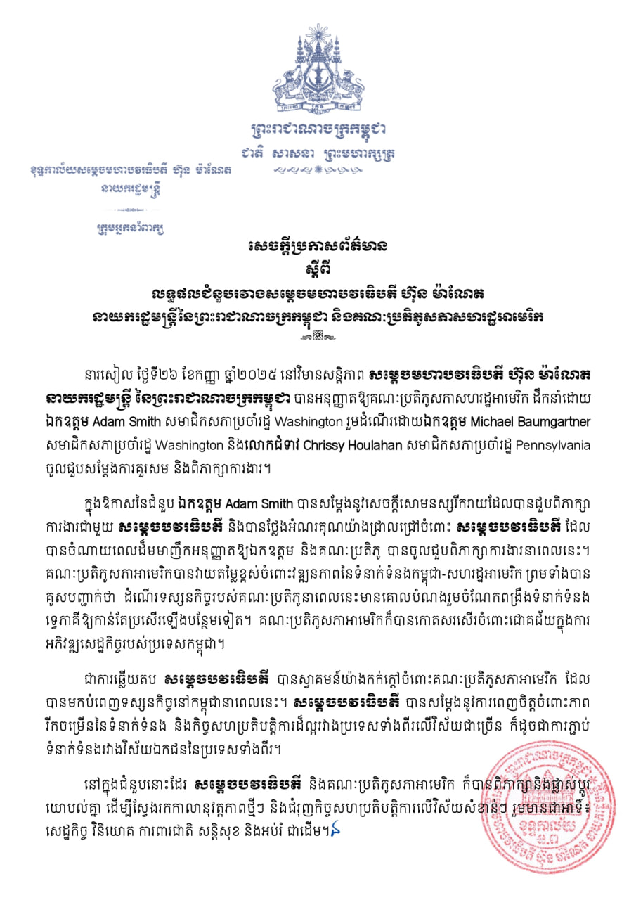 ក្នុងឱកាសនៃជំនួប លោក Adam Smith បានសម្តែងនូវសេចក្តីសោមនស្សរីករាយដែលបានជួបពិភាក្សាការងារជាមួយ សម្តេចបវរធិបតី នាយករដ្ឋមន្ត្រី និងបានថ្លែងអំណរគុណយ៉ាងជ្រាលជ្រៅចំពោះ សម្តេចបវរធិបតី ដែល បានចំណាយពេលដ៏មមាញឹកអនុញ្ញាតឱ្យលោក និងគណៈប្រតិភូ បានចូលជួបពិភាក្សាការងារនាពេលនេះ។ គណៈប្រតិភូសភាអាមេរិក បានវាយតម្លៃខ្ពស់ចំពោះវឌ្ឍនភាពនៃទំនាក់ទំនងកម្ពុជា-សហរដ្ឋអាមេរិក ព្រមទាំងបាន គូសបញ្ជាក់ថា “ដំណើរទស្សនកិច្ចរបស់គណៈប្រតិភូនាពេលនេះ មានគោលបំណងរួមចំណែកពង្រឹងទំនាក់ទំនង ទ្វេភាគីឱ្យកាន់តែប្រសើរឡើងបន្ថែមទៀត”។ គណៈប្រតិភូសភាអាមេរិក ក៏បានកោតសរសើរចំពោះជោគជ័យក្នុងការ អភិវឌ្ឍសេដ្ឋកិច្ចរបស់ប្រទេសកម្ពុជាផងដែរ។