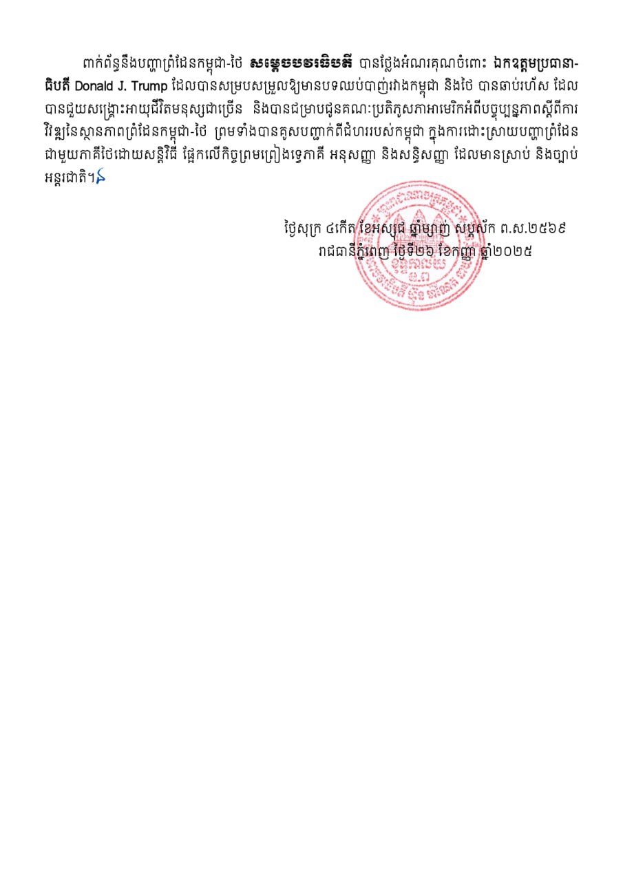 ពាក់ព័ន្ធនឹងបញ្ហាព្រំដែន កម្ពុជា-ថៃ សម្តេចបវរធិបតី បានថ្លែងអំណរគុណចំពោះ លោកប្រធានាធិបតី Donald J. Trump ដែលបានសម្របសម្រួលឱ្យមានបទឈប់បាញ់ រវាងកម្ពុជា និងថៃ បានឆាប់រហ័សដែលបានជួយសង្គ្រោះអាយុជីវិតមនុស្សជាច្រើន និងបានជម្រាបជូនគណៈប្រតិភូសភាអាមេរិក អំពីបច្ចុប្បន្នភាពស្តីពី ការវិវឌ្ឍនៃស្ថានភាពព្រំដែន កម្ពុជា-ថៃ ព្រមទាំងបានគូសបញ្ជាក់ពីជំហររបស់កម្ពុជា ក្នុងការដោះស្រាយបញ្ហាព្រំដែន ជាមួយភាគីថៃ ដោយសន្តិវិធី ផ្អែកលើកិច្ចព្រមព្រៀងទ្វេភាគី អនុសញ្ញា និងសន្ធិសញ្ញា ដែលមានស្រាប់ និងច្បាប់អន្តរជាតិ៕