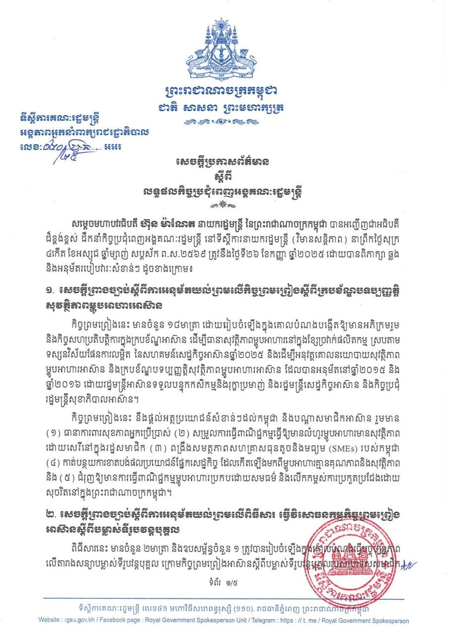សម្តេចធិបតីនាយករដ្ឋមន្ត្រី ហ៊ុន ម៉ាណែត បានបញ្ជាក់យ៉ាងដូច្នេះ ក្នុងកិច្ចប្រជុំពេញអង្គគណៈរដ្ឋមន្រ្តី នាព្រឹកថ្ងៃសុក្រ ទី២៦ ខែកញ្ញា ឆ្នាំ២០២៥ នៅវិមានសន្តិភាព។