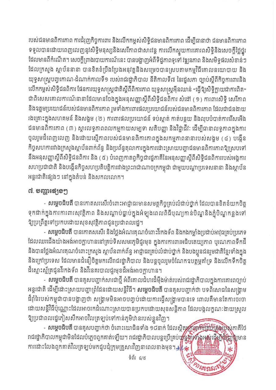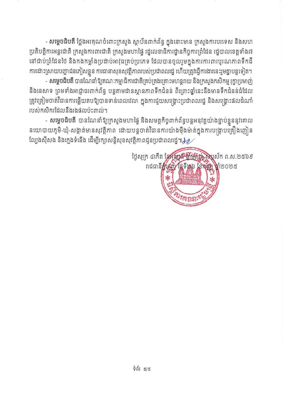 សម្តេចធិបតី នាយករដ្ឋមន្ត្រី បានកោតសសើរ និងថ្លែងអំណរគុណចំពោះវីរកងទ័ព និងកងកម្លាំងប្រដាប់អាវុធគ្រប់ប្រភេទ ដែលឈរជើងយ៉ាងអង់អាចក្លាហាននៅគ្រប់ទិសសមរភូមិជួរមុខ ក្នុងការការពារអធិបតេយ្យភាព បូរណភាពទឹកដី និងបានថ្លែងអំណរគុណចំពោះក្រសួង ស្ថាប័នពាក់ព័ន្ធ អាជ្ញាធរគ្រប់លំដាប់ថ្នាក់ និងបងប្អូនជនរួមជាតិខ្មែរទាំងក្នុង និងក្រៅប្រទេស ដែលមានជំនឿចិត្តមកលើរាជរដ្ឋាភិបាល និងបន្តចូលរួមចំណែកឧបត្ថម្ភគាំទ្រ និងលើកទឹកចិត្ត ដ៏ស្មោះស្ម័គ្រជូនវីរកងទ័ព និងវីរនគរបាលជួរមុខដ៏អង់អាចក្លាហាន។