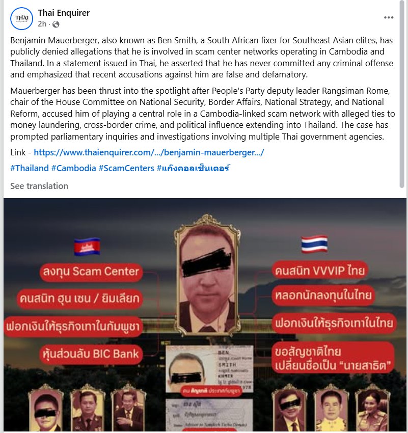លោក Benjamin Mauerberger ជាជនជាតិអាហ្វ្រិកខាងត្បូង និងជាអ្នករៀបចំដោះស្រាយកិច្ចការសម្រាប់អ្នកមានឥទ្ធិពលនៅអាស៊ីអាគ្នេយ៍ បានចេញសេចក្តីថ្លែងការណ៍មួយនៅក្នុងប្រទេសថៃ ក្នុងការបដិសេធការចោទប្រកាន់មកលើគាត់ ជុំវិញការប្រព្រឹត្តបទល្មើសព្រហ្មទណ្ឌ ពាក់ព័ន្ធជាមួយបណ្តាញមជ្ឈមណ្ឌលឆបោកក្នុងប្រទេសកម្ពុជានិងប្រទេសថៃ។ នេះបើតាមការចេញផ្សាយពីសារព័ត៌មានស្រុកថៃ Thai Enquirer នៅថ្ងៃទី៣ តុលា ឆ្នាំ២០២៥។
