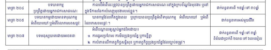ភ្នំពេញ៖ អ្នកជំនាញផ្នែកច្បាប់បានលើកឡើងថា បទល្មើស «ឃាតកម្ម» ត្រូវបានប្រព្រឹត្តដោយអ្នករាជការសាធារណៈនៅក្នុងក្របខ័ណ្ឌនៃមុខងារ ឬនៅក្នុងឱកាសនៃការបំពេញមុខងាររបស់ខ្លួន ត្រូវផ្តន្ទាទោសដាក់ពន្ធនាគារពី ១៥ឆ្នាំ ទៅ ៣០ឆ្នាំ មាត្រា២០៤ នៃក្រមព្រហ្មទណ្ឌ។