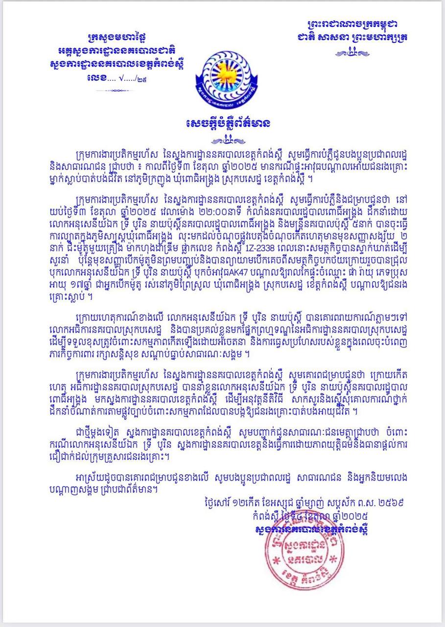 ជុំវិញហេតុការណ៍នេះ ក្រុមការងារប្រតិកម្មរហ័ស នៃស្នងការដ្ឋាននគរបាលខេត្តកំពង់ស្ពឺ បានធ្វើការបំភ្លឺថា៖ នៅ យប់ថ្ងៃទី០៣ ខែតុលា ឆ្នាំ២០២៥ វេលាម៉ោង ២២និង០០នាទី កំលាំងនគរបាលរដ្ឋបាលពោធិ៍អង្ក្រង ដឹកនាំដោយ លោកអនុសេនីយ៍ឯក ទ្រី បូរិន នាយប៉ុស្តិ៍នគរបាលរដ្ឋបាលពោធិ៍អង្ក្រង និងមន្ត្រីនគរបាលប៉ុស្តិ៍ ចំនួន ០៥នាក់ បានចុះធ្វើការល្បាតក្នុងភូមិសាស្ត្រឃុំពោធិ៍អង្ក្រង លុះមកដល់ចំណុចផ្លូវបេតុង ចំណុចកើតហេតុមានមុខសញ្ញាសង្ស័យ ចំនួន ០២ នាក់ ជិះម៉ូតូ ០១ គ្រឿង ម៉ាកហុងដាឌ្រីម ស្លាកលេខ កំពង់ស្ពឺ 1Z-2338 ពេលនោះសមត្ថកិច្ចបានស្ទាក់ឃាត់ ដើម្បីសួរនាំ ប៉ុន្តែមុខសញ្ញាបើកម៉ូតូមិនព្រមបញ្ឈប់ និងបានព្យាយាមបើកគេចពីសមត្ថកិច្ចបកថយក្រោយរួចបានជ្រុលបុកលោកអនុសេនីយ៍ឯក ទ្រី បូរិន នាយប៉ុស្តិ៍ បុកចំអាវុធ AK47 បណ្តាលឱ្យរាលកៃផ្ទះចំឈ្មោះ ផា រ៉ាយុ ភេទប្រុស អាយុ ១៧ឆ្នាំ ជាអ្នកបើកម៉ូតូ រស់នៅភូមិព្រៃស្រួល ឃុំពោធិអង្គ្រង ស្រុកបសេដ្ឋ ខេត្តកំពង់ស្ពឺ បណ្តាលឱ្យជនរងគ្រោះស្លាប់ ។