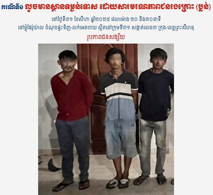 បំបែកសំណុំរឿងប្លន់សម្លាប់ចៅកែអេតចាយ នៅក្រុងព្រះសីហនុ យកលុយ២៤លានរៀល និងសម្ភារៈមួយចំនួនទៀត ឃាត់ខ្លួនជនសង្ស័យ ចំនួន ០៣នាក់