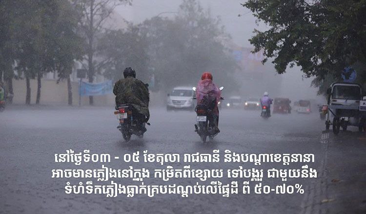នៅថ្ងៃទី០៣ – ០៥ ខែតុលា រាជធានី និងបណ្តាខេត្តនានា អាចមានភ្លៀងនៅក្នុង កម្រិតពីខ្សោយ ទៅបង្គួរ ជាមួយនឹងទំហំទឹកភ្លៀងធ្លាក់គ្របដណ្តប់លើផ្ទៃដី ពី ៥០-៧០%