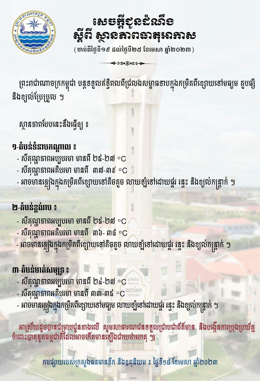 ក្រសួងធនធានទឹក ជូនដំណឹងពីស្ថានភាពធាតុអាកាស ចាប់ពីថ្ងៃនេះ ដល់ថ្ងៃទី២៥ ខែមេសា, សីតុណ្ហភាពកើនដល់ជិត ៤០អង្សាសេ និងអាចមានភ្លៀងលាយឡំផ្គរ រន្ទះ និងខ្យល់កន្ត្រាក់