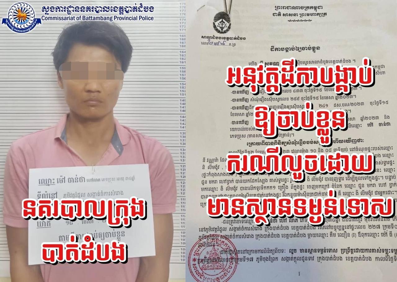 នគរបាលក្រុងបាត់ដំបង អនុវត្តដីកាបង្គាប់ឱ្យចាប់ខ្លួនជនជាប់ ចោទម្នាក់ ក្នុងករណីលួចដោយមានស្ថានទម្ងន់ទោស