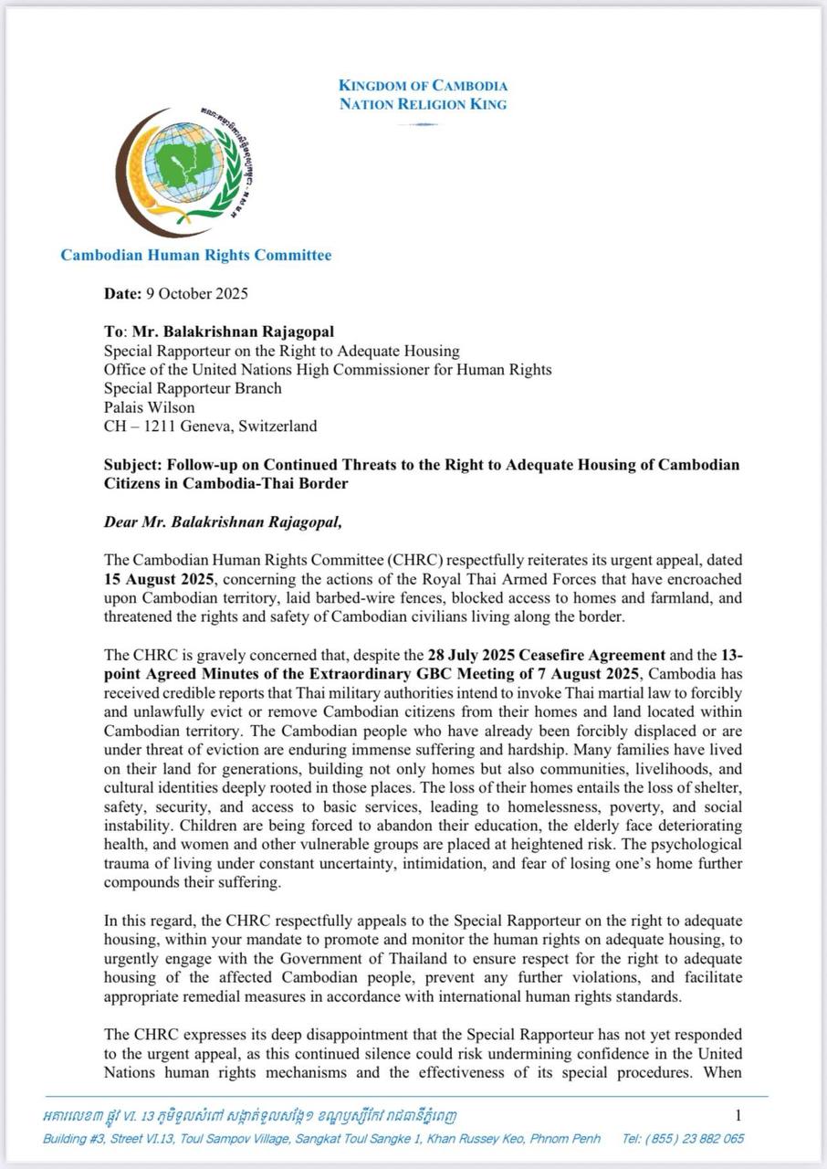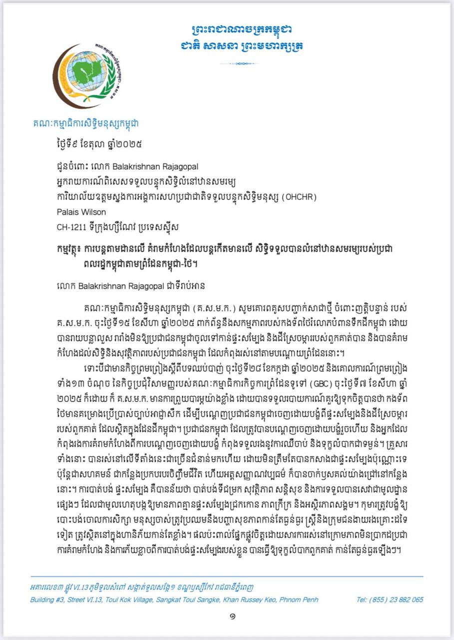 ភ្នំពេញ៖ គណៈកម្មាធិការសិទ្ធិមនុស្សកម្ពុជា បានដាក់លិខិតជូនលោក Balakrishnan Rajagopal អ្នករាយការណ៍ពិសេសទទួលបន្ទុកសិទ្ធិលំនៅឋានសមរម្យ នៃការិយាល័យឧត្តមស្នងការអង្គការសហប្រជាជាតិទទួលបន្ទុកសិទ្ធិមនុស្ស «OHCHR» ពាក់ព័ន្ធនឹងការបន្តតាមដានលើការគំរាមកំហែងដែលបន្តកើតមានលើសិទ្ធិទទួលបានលំនៅឋានសមរម្យរបស់ប្រជាពលរដ្ឋកម្ពុជា តាមព្រំដែន កម្ពុជា-ថៃ។