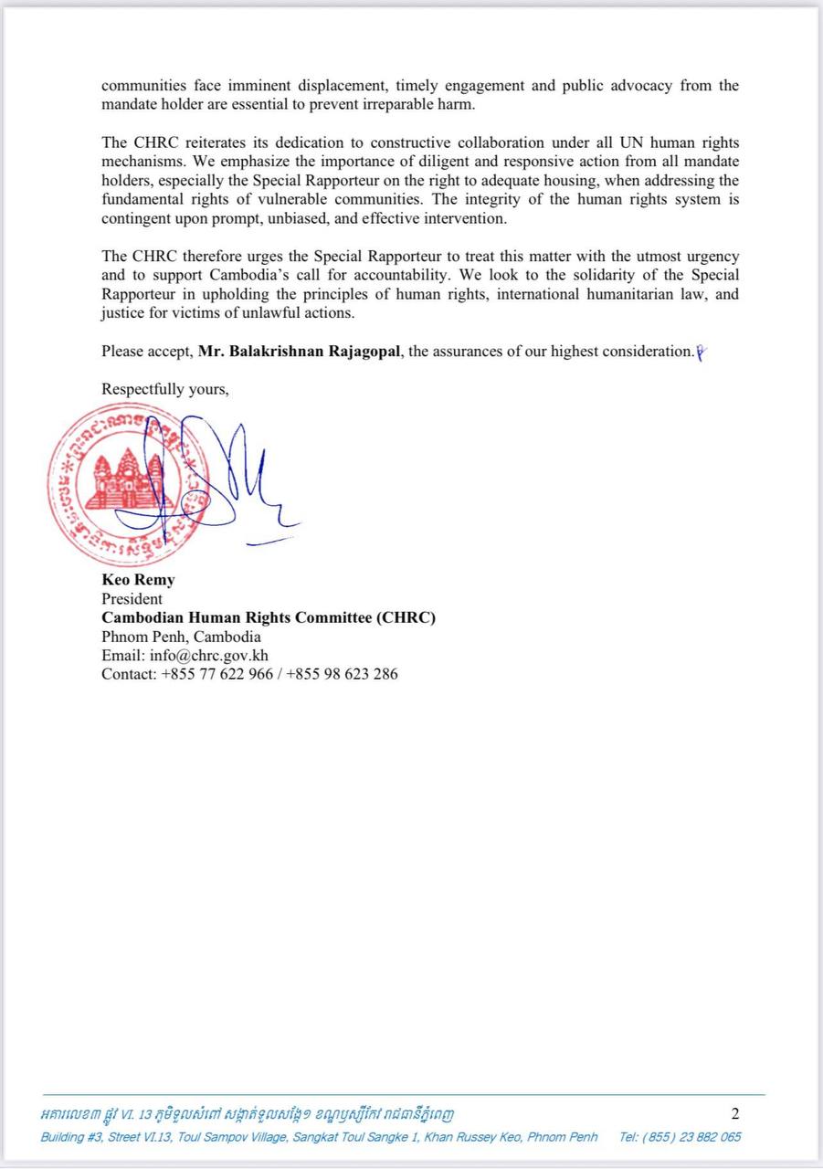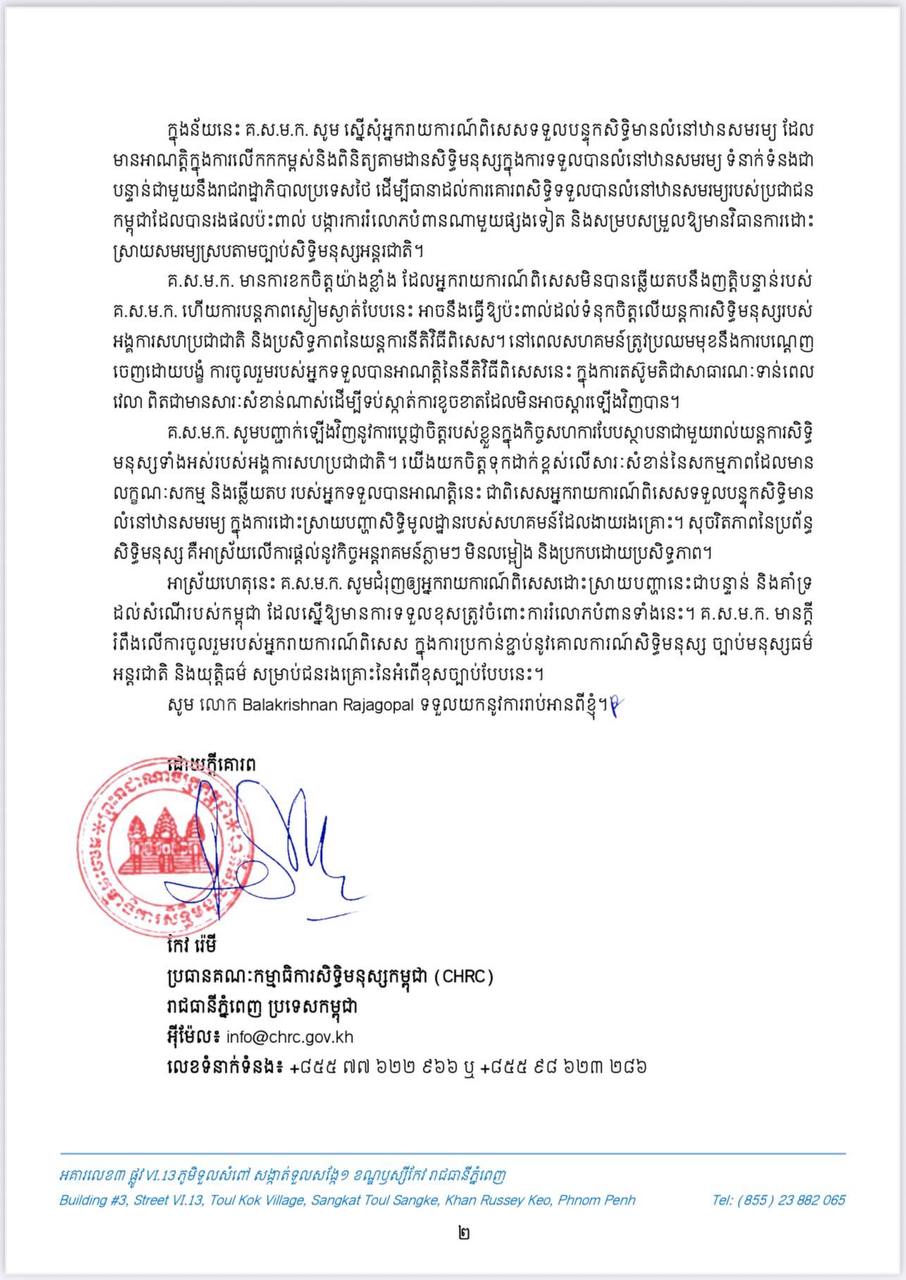 គ.ស.ម.ក. សូមបញ្ជាក់ឡើងវិញនូវការប្តេជ្ញាចិត្តរបស់ខ្លួនក្នុងកិច្ចសហការបែបស្ថាបនាជាមួយរាល់យន្តការសិទ្ធិ មនុស្សទាំងអស់របស់អង្គការសហប្រជាជាតិ។ យើងយកចិត្តទុកដាក់ខ្ពស់លើសារៈសំខាន់នៃសកម្មភាពដែលមានលក្ខណៈសកម្ម និងឆ្លើយតប របស់អ្នកទទួលបានអាណត្តិនេះ ជាពិសេសអ្នករាយការណ៍ពិសេសទទួលបន្ទុកសិទ្ធិមានលំនៅឋានសមរម្យ ក្នុងការដោះស្រាយបញ្ហាសិទ្ធិមូលដ្ឋានរបស់សហគមន៍ដែលងាយរងគ្រោះ។ សុចរិតភាពនៃប្រព័ន្ធសិទ្ធិមនុស្ស គឺអាស្រ័យលើការផ្តល់នូវកិច្ចអន្តរាគមន៍ភ្លាមៗ មិនលម្អៀង និងប្រកបដោយប្រសិទ្ធភាព។គ.ស.ម.ក. សូមជំរុញឲ្យអ្នករាយការណ៍ពិសេសដោះស្រាយបញ្ហានេះជាបន្ទាន់ និងគាំទ្រដល់សំណើរបស់កម្ពុជា ដែលស្នើឱ្យមានការទទួលខុសត្រូវចំពោះការរំលោភបំពានទាំងនេះ។ គ.ស.ម.ក. មានក្តីរំពឹងលើការចូលរួមរបស់អ្នករាយការណ៍ពិសេស ក្នុងការប្រកាន់ខ្ជាប់នូវគោលការណ៍សិទ្ធិមនុស្ស ច្បាប់មនុស្សធម៌ អន្តរជាតិ និងយុត្តិធម៌ សម្រាប់ជនរងគ្រោះនៃអំពើខុសច្បាប់បែបនេះ៕