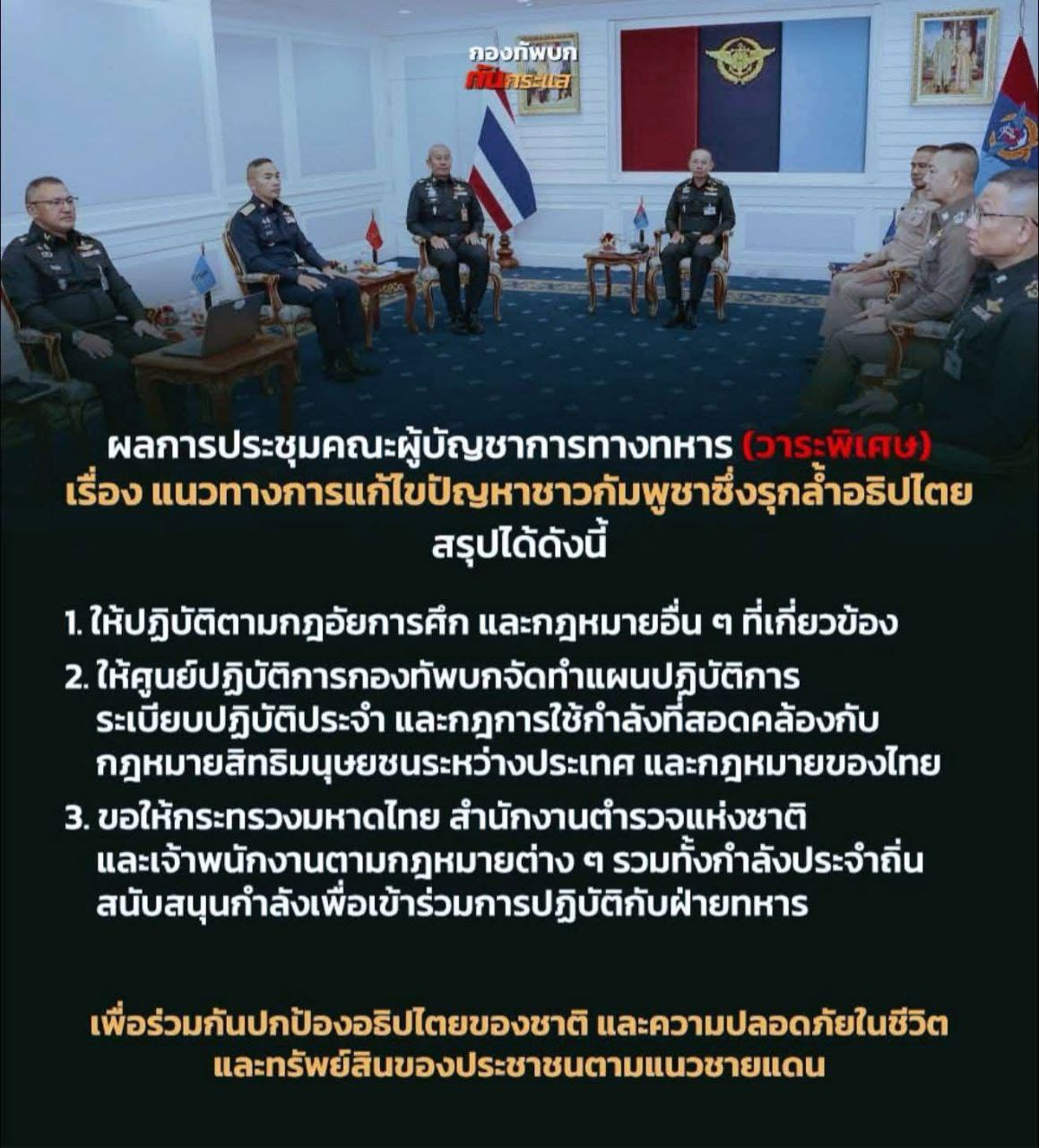 ទោះបីជាមានកិច្ចព្រមព្រៀង ស្តីពី បទឈប់បាញ់ ចុះថ្ងៃទី២៨ ខែកក្កដា ឆ្នាំ២០២៥ និងគោលការណ៍ព្រមព្រៀង ទាំង១៣ ចំណុច នៃកិច្ចប្រជុំវិសាមញ្ញរបស់គណៈកម្មាធិការកិច្ចការព្រំដែនទូទៅ (GBC) ចុះថ្ងៃទី៧ ខែសីហា ឆ្នាំ ២០២៥ ក៏ដោយ ក៏ គ.ស.ម.ក. មានការព្រួយបារម្ភយ៉ាងខ្លាំង ដោយបានទទួលរបាយការណ៍គួរឱ្យទុកចិត្តបានថា កងទ័ពថៃមានគម្រោងប្រើប្រាស់ «ច្បាប់អាជ្ញាសឹក» ដើម្បីបណ្តេញប្រជាជនកម្ពុជា ចេញដោយបង្ខំពីផ្ទះសម្បែង និងដីស្រែចម្ការរបស់ពួកគាត់ ដែលស្ថិតក្នុងដែនដីកម្ពុជា។ ប្រជាជនកម្ពុជា ដែលត្រូវបានបណ្តេញចេញដោយបង្ខំរួចហើយ និងអ្នកដែលកំពុងរងការគំរាមកំហែងពីការបណ្តេញចេញដោយបង្ខំ កំពុងទទួលរងនូវការឈឺចាប់ និងទុក្ខលំបាកជាទម្ងន់។ គ្រួសារទាំងនោះ បានរស់នៅលើទីតាំងនេះជាច្រើនជំនាន់មកហើយ ដោយមិនត្រឹមតែបានកសាងជាផ្ទះសម្បែងប៉ុណ្ណោះទេ ប៉ុន្តែជាសហគមន៍ ជាកន្លែងប្រកបរបរចិញ្ចឹមជីវិត ហើយអត្តសញ្ញាណវប្បធម៌ ក៏បានចាក់ឫសគល់យ៉ាងជ្រៅនៅកន្លែងនោះ។