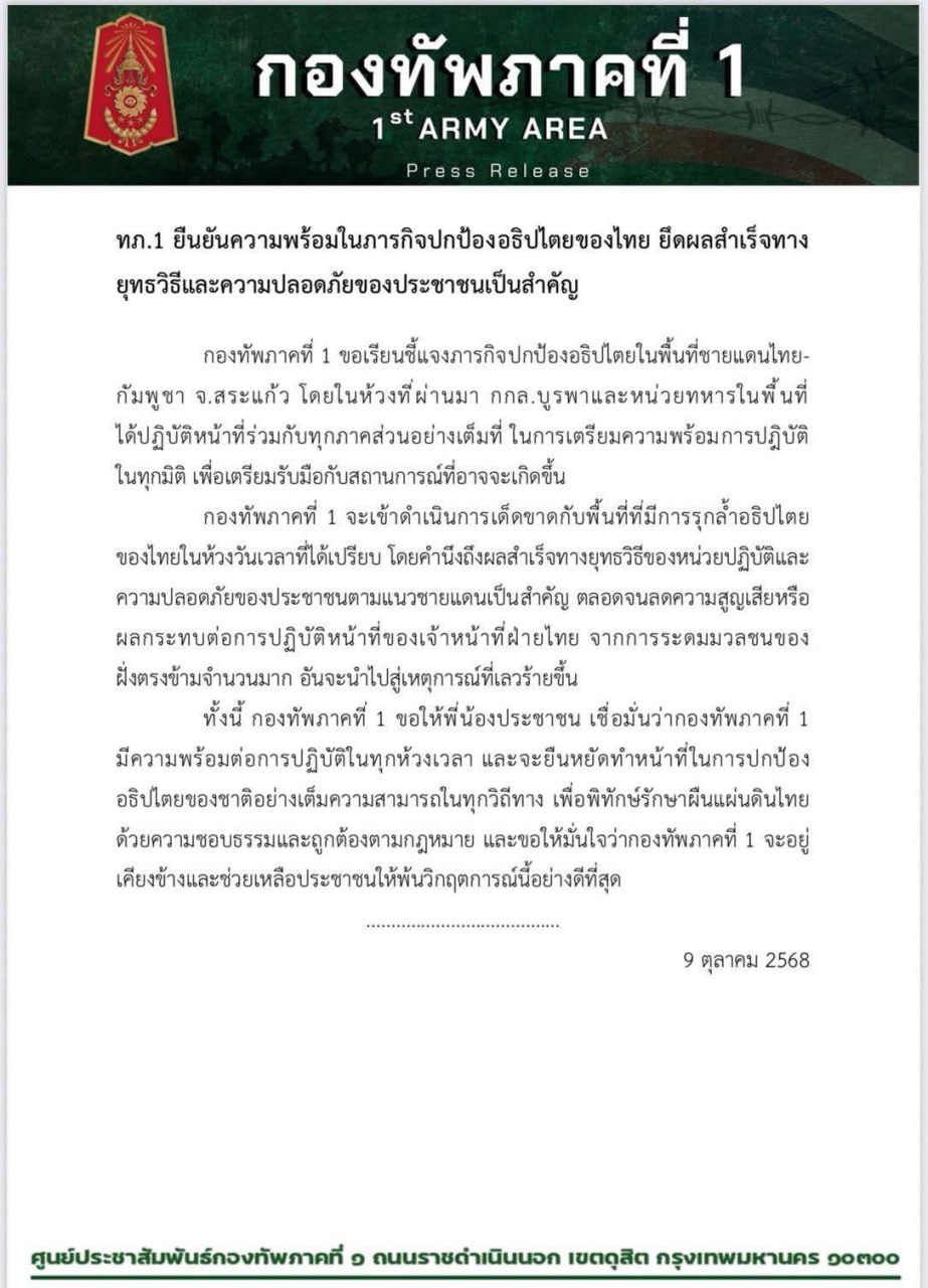 [អំពីបច្ចុប្បន្នភាព] កងទ័ពភូមិភាគទី១ថៃ បាននិយាយថា ខ្លួនបានត្រៀមខ្លួនរួចជាស្រេច ដើម្បីការពារអធិបតេយ្យភាពរបស់ប្រទេសថៃ នៅតាមព្រំដែន កម្ពុជា-ថៃ ក្នុងខេត្តស្រះកែវ ដោយផ្តល់អាទិភាពដល់ភាពជោគជ័យនៃប្រតិបត្តិការ និងសុវត្ថិភាពសាធារណៈ។