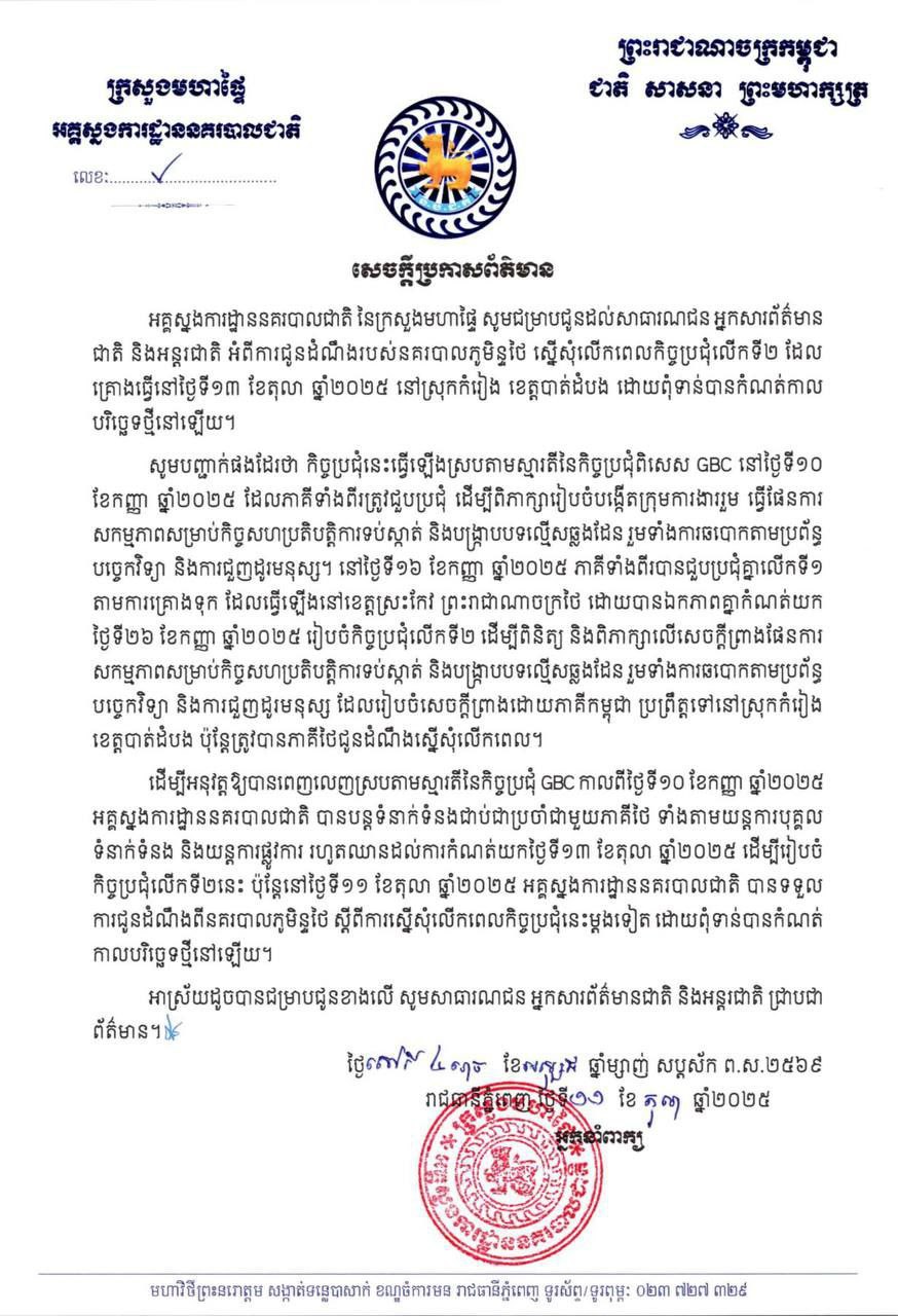 ភ្នំពេញ៖ នគរបាលភូមិន្ទថៃ ស្នើសុំលើកពេលកិច្ចប្រជុំលើកទី២ ដែលគ្រោងធ្វើនៅថ្ងៃទី១៣ ខែតុលា ឆ្នាំ២០២៥ ខាងមុខនេះ នៅស្រុកកំរៀង ខេត្តបាត់ដំបង ដោយពុំទាន់បានកំណត់កាលបរិច្ឆេទថ្មីនៅឡើយទេ។ នេះបើយោងតាមសេចក្តីប្រកាសព័ត៌មានរបស់អ្នកនាំពាក្យអគ្គស្នងការដ្ឋាននគរបាលជាតិកម្ពុជា នារសៀល ថ្ងៃសៅរ៍ ទី១១ ខែតុលានេះ។