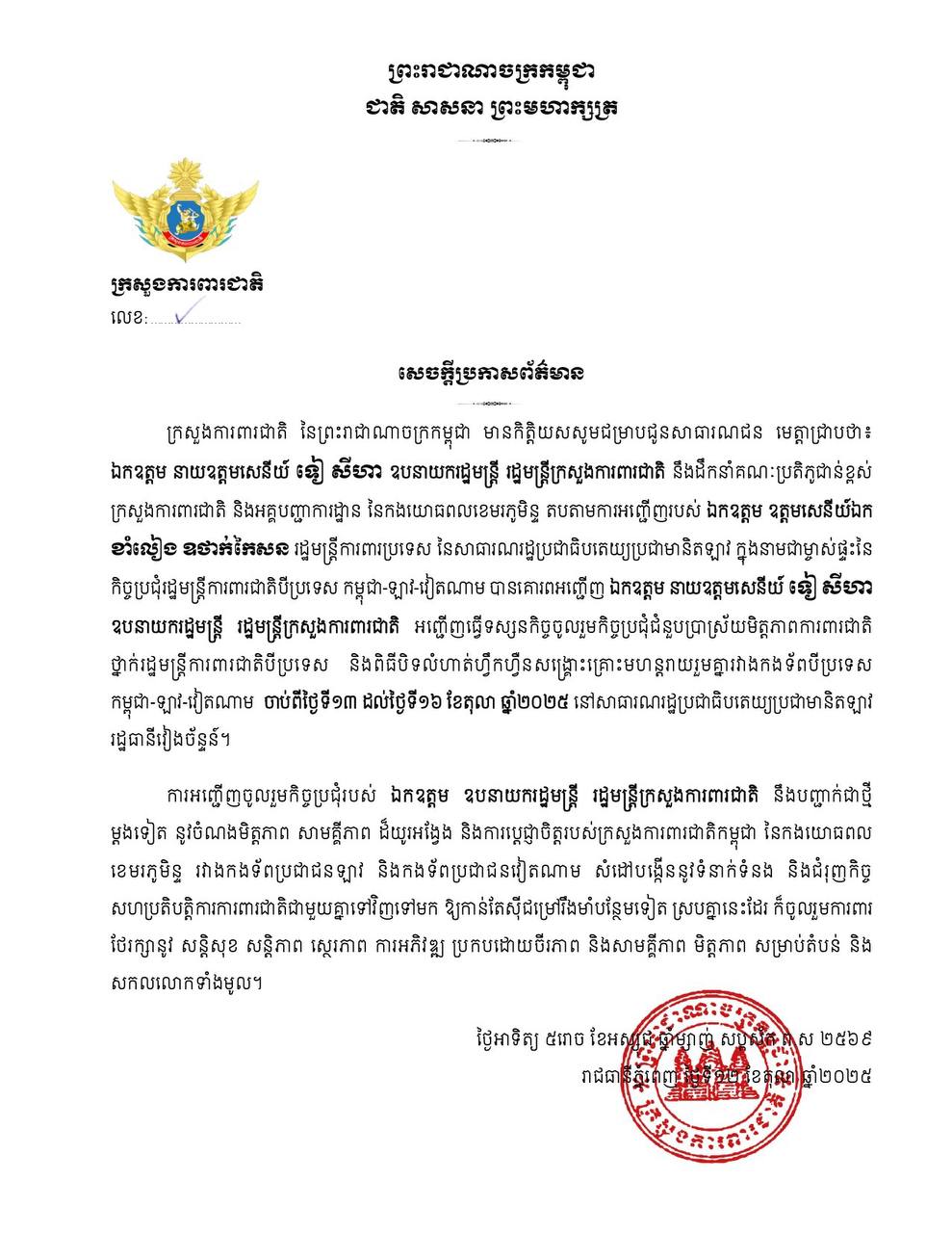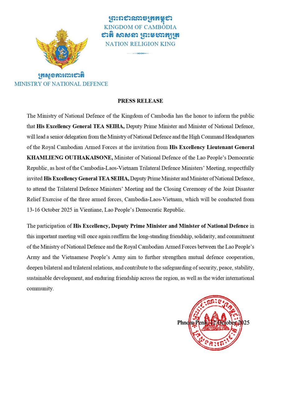 ក្រសួងការពារជាតិកម្ពុជា នៅថ្ងៃចន្ទ ទី១៣ ខែតុលានេះ នាយឧត្តមសេនីយ៍ ទៀ សីហា នឹងដឹកនាំគណៈប្រតិភូជាន់ខ្ពស់ ក្រសួងការពារជាតិ និងអគ្គបញ្ជាការដ្ឋាន នៃកងយោធពលខេមរភូមិន្ទ តបតាមការអញ្ជើញរបស់ឧត្តមសេនីយ៍ឯក ខាំលៀង ឧថាក់កែសន រដ្ឋមន្ត្រីការពារប្រទេស នៃសាធារណរដ្ឋប្រជាធិបតេយ្យប្រជាមានិតឡាវ ក្នុងនាមជាម្ចាស់ផ្ទះនៃ កិច្ចប្រជុំរដ្ឋមន្ត្រីការពារជាតិបីប្រទេស កម្ពុជា-ឡាវ-វៀតណាម ដើម្បីធ្វើទស្សនកិច្ចចូលរួមកិច្ចប្រជុំជំនួបប្រាស្រ័យមិត្តភាពការពារជាតិ ថ្នាក់រដ្ឋមន្ត្រីការពារជាតិបីប្រទេស និងពិធីបិទលំហាត់ហ្វឹកហ្វឺនសង្គ្រោះគ្រោះមហន្តរាយរួមគ្នារវាងកងទ័ពបីប្រទេស កម្ពុជា-ឡាវ-វៀតណាម ចាប់ពីថ្ងៃទី១៣ ដល់ថ្ងៃទី១៦ ខែតុលា ឆ្នាំ២០២៥ នៅសាធារណរដ្ឋប្រជាធិបតេយ្យប្រជាមានិតឡាវ រដ្ឋធានីវៀងច័ន្ទន៍។