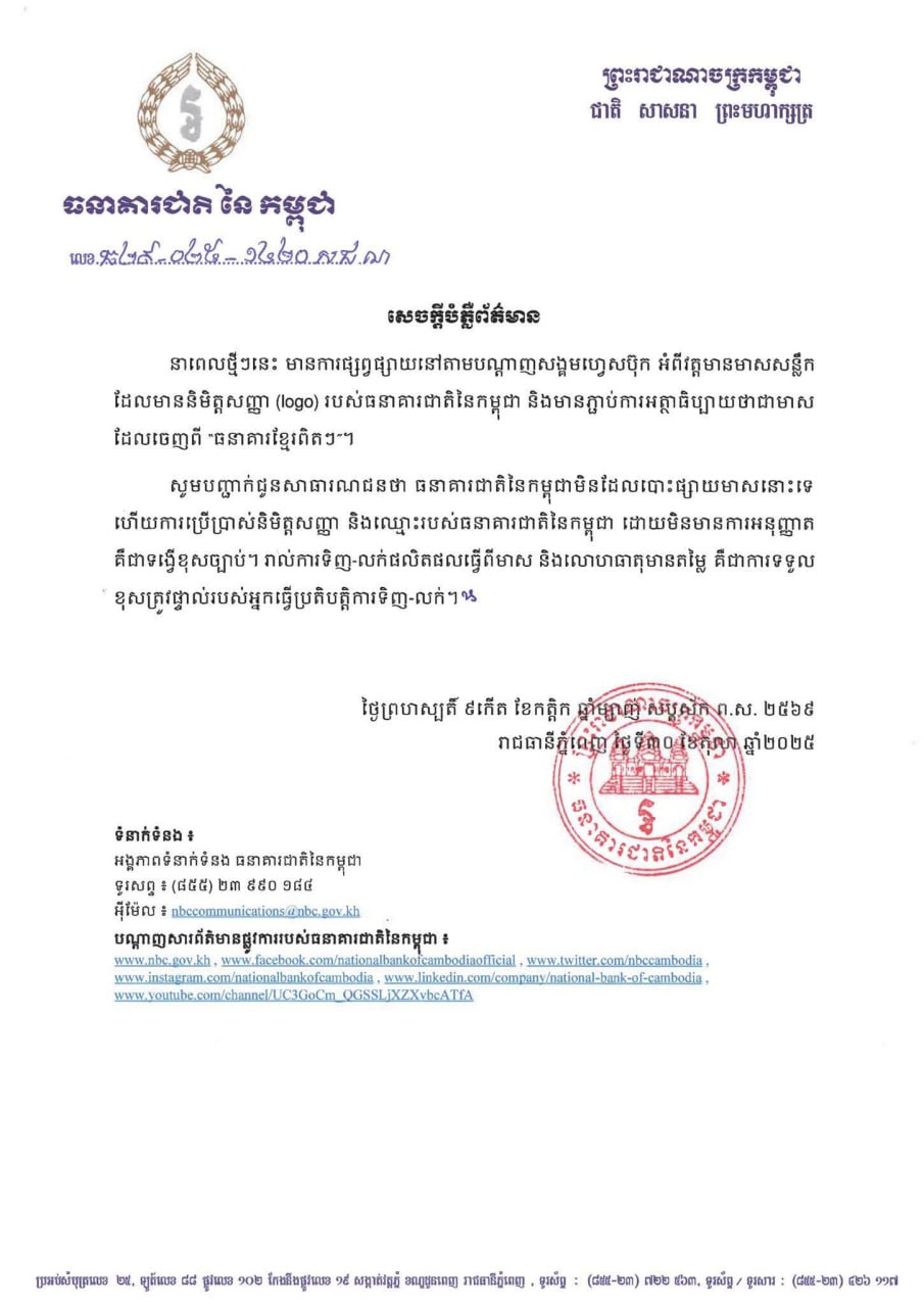ភ្នំពេញ៖ ធនាគារជាតិ នៃកម្ពុជា នៅថ្ងៃទី៣០ ខែតុលា ឆ្នាំ២០២៥នេះ បានចេញសេចក្ដីបដិសេធថា «ខ្លនមិនបានបោះពុម្ភមាសសន្លឹក ដែលមាននិមិត្តសញ្ញា (logo) របស់ធនាគារជាតិនៃកម្ពុជា ដូចការផ្សព្វផ្សាយលើបណ្តាញសង្គមនោះទេ។ ក្នុងករណីការប្រើប្រាស់និមិត្តសញ្ញា និងឈ្មោះរបស់ធនាគារជាតិ ជាទង្វើខុសច្បាប់សាម៊ីខ្លួនត្រូវទទួលខុសត្រូវចំពោះមុខច្បាប់ជាធរមាន។