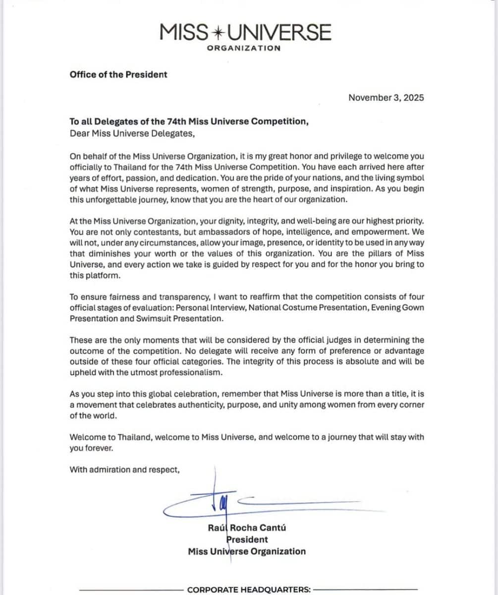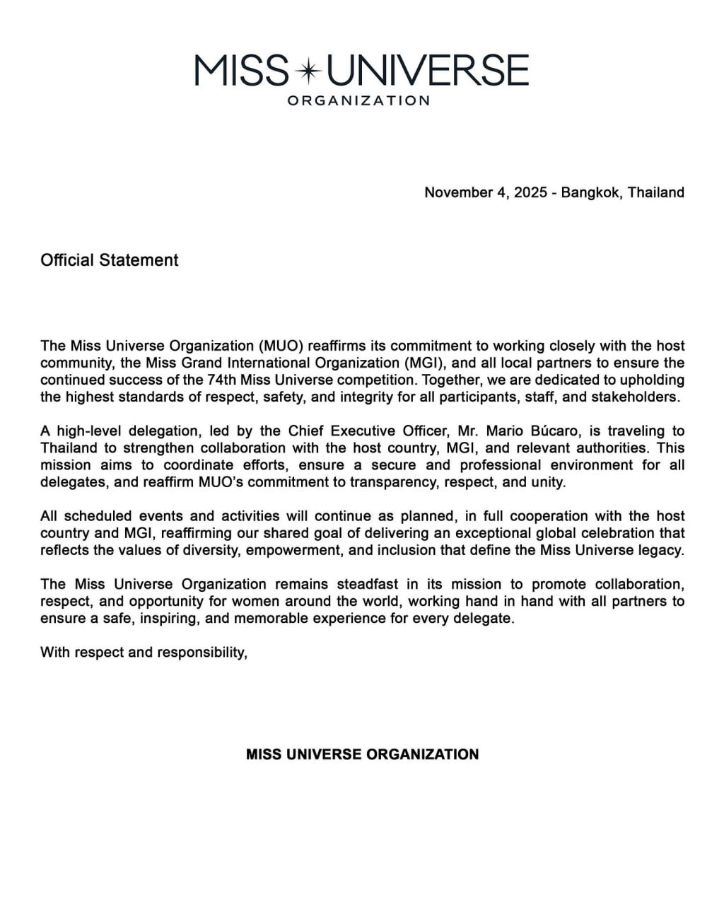 សេចក្តីថ្លែងការណ៍នេះ បន្ទាប់ពីមានហេតុការណ៍មួយដែល Miss Universe Mexico និងបេក្ខនារីផ្សេងទៀតបានដើរចេញពីមុខ លោក Nawat Itsaragrisil ប្រធានគណៈកម្មាធិការរៀបចំកម្មវិធី Miss Universe Thailand ក្នុងពិធី Sashing នៃកម្មវិធី Miss universe 2025 លើកទី៧៤។