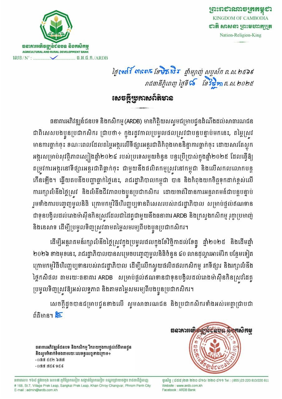 (ភ្នំពេញ)៖ នេះបើយោងតាមសេចក្តីប្រកាសព័ត៌មានរបស់ធនាគារអភិវឌ្ឍន៍ជនបទ និងកសិកម្ម(ARDB)បានឲ្យដឹងថា៖ រាជរដ្ឋាភិបាលកម្ពុជាបានសម្រេចបញ្ចេញមូលនិធិចំនួន៤០លានដុល្លារបន្ថែម ក្រោមកម្មវិធីហិរញ្ញប្បទានពិសេសរបស់រាជរដ្ឋាភិបាល សម្រាប់ជួយដល់ការប្រមូលទិញស្រូវក្នុងរដូវច្រូតកាត់ចុងឆ្នាំ២០២៥ និងដើមឆ្នាំ២០២៦ ដើម្បីដោះស្រាយបញ្ហាធ្លាក់តម្លៃស្រូវ។