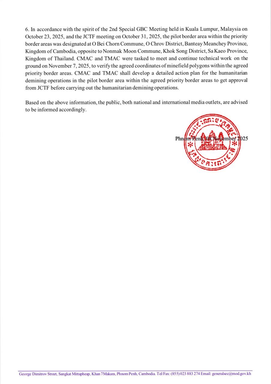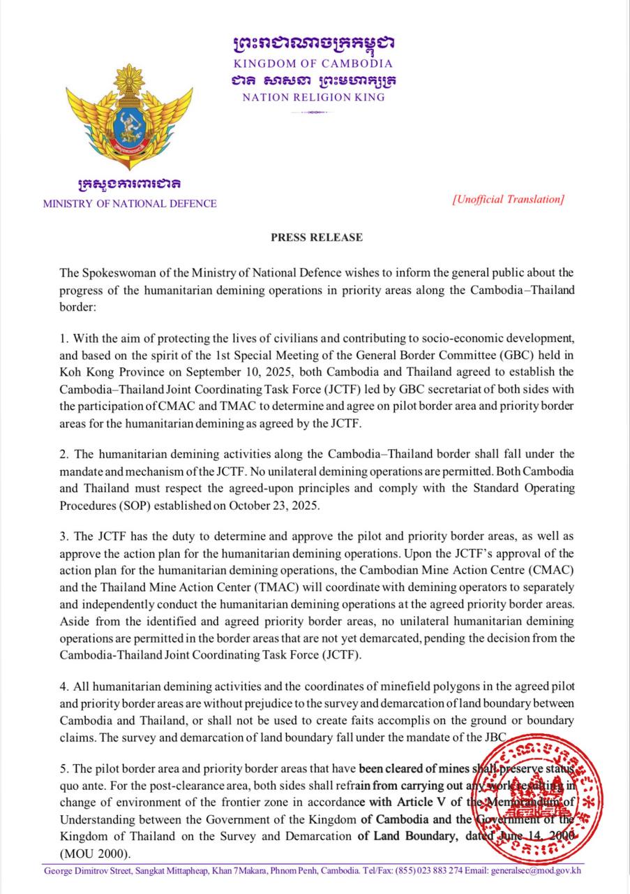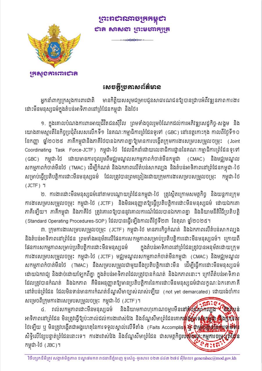 ក្នុងសេចក្តីប្រកាសព័ត៌មានដែលចេញផ្សាយដោយអ្នកនាំពាក្យក្រសួងការពារជាតិ លោកស្រីឧត្តមសេនីយ៍ឯក ម៉ាលី សុជាតា បានបញ្ជាក់ថា «ការងារដោះមីននឹងត្រូវអនុវត្តតាមគោលការណ៍ និងនិយាមនិតិវិធីប្រតិប្តិការ SOP ដែលបានព្រមព្រៀងក្នុងកិច្ចប្រជុំពិសេសលើកទី២ នៃគណៈកម្មាធិការព្រំដែនទូទៅ (GBC) នៅទីក្រុងកូឡាឡាំពួ ប្រទេសម៉ាឡេស៊ី»។