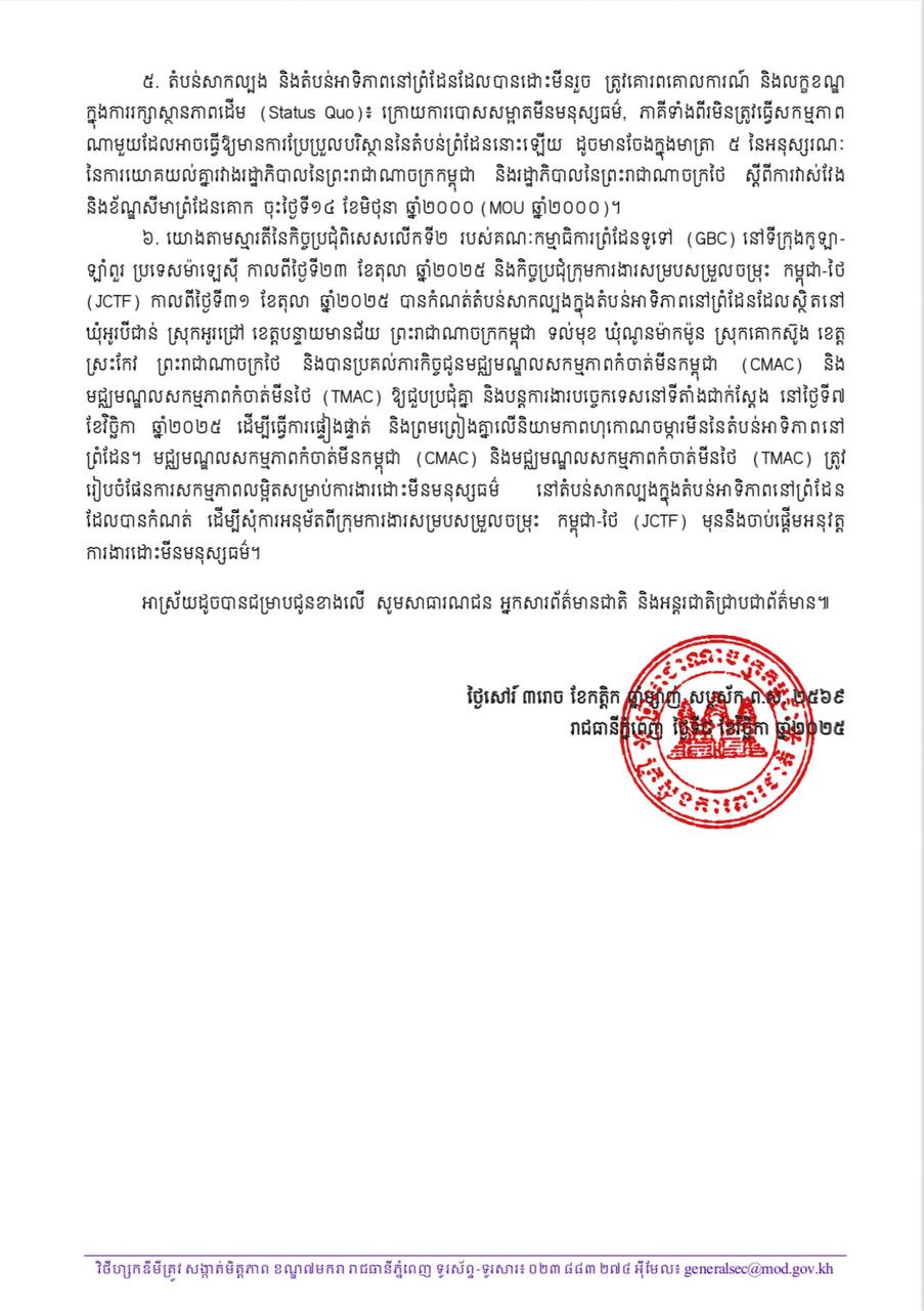 ក្រសួងការពារជាតិបានបញ្ជាក់ថា «ការងារនេះនឹងជួយការពារជីវិតប្រជាពលរដ្ឋ និងជួយអភិវឌ្ឍសេដ្ឋកិច្ច-សង្គមនៅតំបន់ព្រំដែន។ ការសហការរវាងកម្ពុជា និងថៃត្រូវបានចាត់ទុកជាជំហានសំខាន់មួយក្នុងការបង្កើនសន្តិភាព និងស្ថិរភាពតំបន់»៕