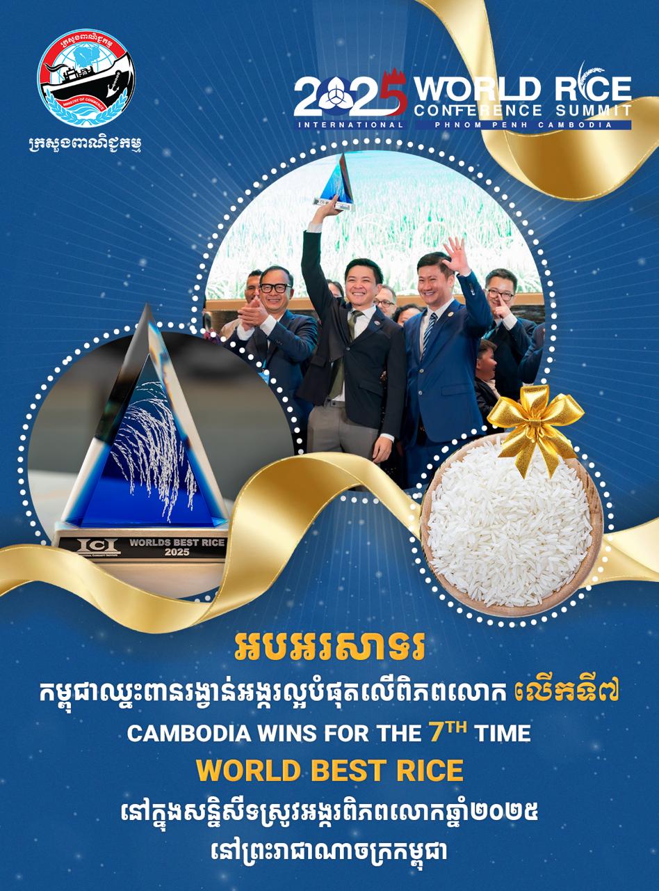 ភ្នំពេញ៖ កម្ពុជា បានបង្កើតកិត្តិយសជាតិឡើងវិញជាលើកទី ៧ ដោយឈ្នះពានរង្វាន់អង្ករល្អបំផុតលើពិភពលោក (World’s Best Rice 2025) ក្នុងសន្និសីទស្រូវអង្ករពិភពលោក ដែលរៀបចំដោយ The Rice Trader នៅរាជធានីភ្នំពេញ ព្រះរាជាណាចក្រកម្ពុជា ចាប់ពីថ្ងៃទី ៧ ដល់ ៩ ខែវិច្ឆិកា ឆ្នាំ ២០២៥។ ពានរង្វាន់នេះ ជាសញ្ញាបង្ហាញពីគុណភាពខ្ពស់នៃអង្ករកម្ពុជា ដែលទទួលបានការទទួលស្គាល់អន្តរជាតិ។