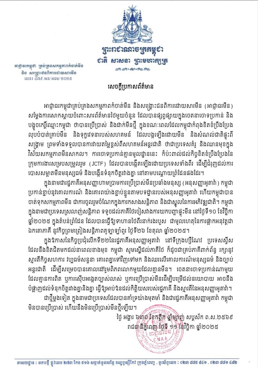 អាជ្ញាធរមីន បានបញ្ជាក់ថា ក្នុងនាមជារដ្ឋភាគីអនុសញ្ញាហាមប្រាមការប្រើប្រាស់មីនប្រឆាំងមនុស្ស (អនុសញ្ញាអូតាវ៉ា) កម្ពុជា ប្រកាន់ខ្ជាប់នូវគោលការណ៍ និងគោរពយ៉ាងខ្ជាប់ខ្ជួនតាមបទដ្ឋានរបស់អនុសញ្ញាអូតាវ៉ា ហើយកម្ពុជាបាន ចាត់ទុកសកម្មភាពមីន ជាការចូលរួមចំណែកក្នុងការកសាងសន្តិភាព និងជាស្នូលនៃការអភិវឌ្ឍជាតិ។ កម្ពុជា ក្នុងនាមជាប្រទេសស្រលាញ់សន្តិភាព ទទួចដល់ភាគីថៃចៀសវាងការយកបញ្ហាផ្ទុះមីន នៅថ្ងៃទី១០ ខែវិច្ឆិកា ឆ្នាំ២០២៥ ក្នុងតំបន់ព្រំដែន ដែលបានធ្វើឱ្យទាហានថៃពីរនាក់ រងរបួស ជាមូលហេតុនៃការផ្អាកអនុវត្តជា ឯកតោភាគីនូវកិច្ចព្រមព្រៀងសន្តិភាពគូឡាឡាំពួរ ថ្ងៃទី២៦ ខែតុលា ឆ្នាំ២០២៥។