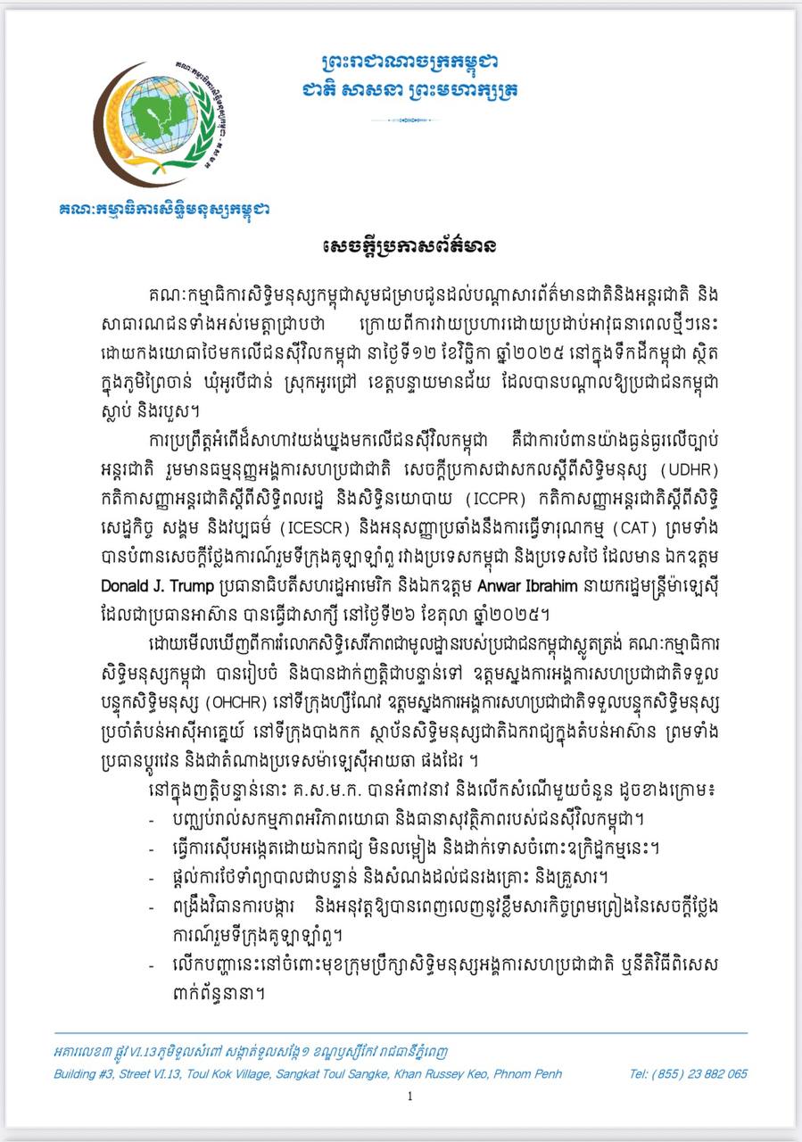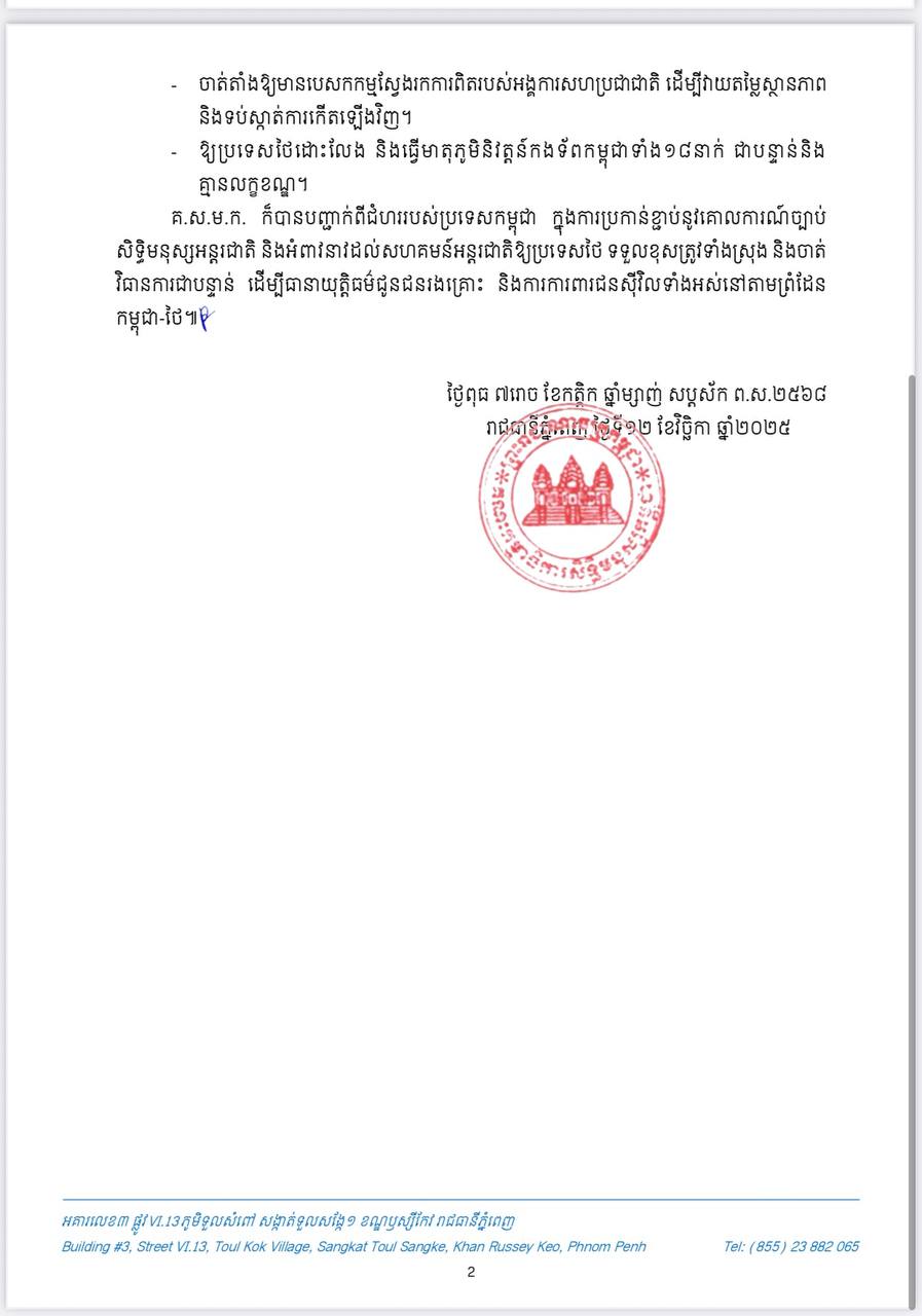 គ.ស.ម.ក. ក៏បានបញ្ជាក់ពីជំហររបស់ប្រទេសកម្ពុជា ក្នុងការប្រកាន់ខ្ជាប់នូវគោលការណ៍ច្បាប់ សិទ្ធិមនុស្សអន្តរជាតិ និងអំពាវនាវដល់សហគមន៍អន្តរជាតិ ឱ្យប្រទេសថៃ ទទួលខុសត្រូវទាំងស្រុង និងចាត់វិធានការជាបន្ទាន់ ដើម្បីធានាយុត្តិធម៌ ជូនជនរងគ្រោះ និងការការពារជនស៊ីវិលទាំងអស់នៅតាមព្រំដែន កម្ពុជា-ថៃ៕_1763004549.jpg)