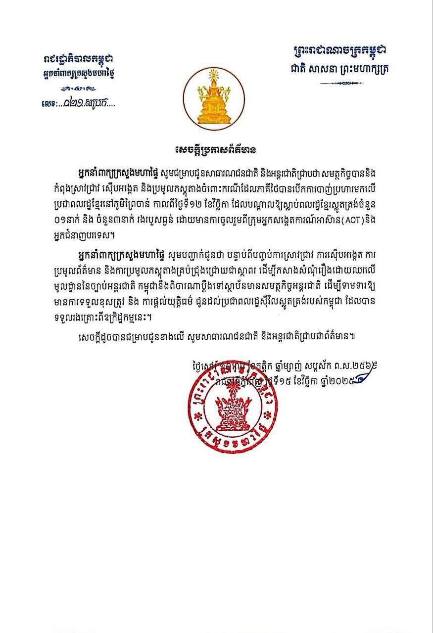 ភ្នំពេញ៖ សួងមហាផ្ទៃកម្ពុជា បានប្រកាសនៅថ្ងៃសៅរ៍ ទី១៥ ខែវិច្ឆិកា នេះថា សមត្ថកិច្ចកំពុងបន្តការស៊ើបអង្កេតពេញលេញលើករណី ដែលកម្លាំងយោធាថៃ បានបើកការបាញ់ប្រហារលើប្រជាជនស្លូតត្រង់ខ្មែរ នៅភូមិព្រៃចាន់ ឃុំអូរបីជាន់ ស្រុកអូរជ្រៅ កាលពីថ្ងៃទី១២ ខែវិច្ឆិកា បណ្ដាលឱ្យស្លាប់មនុស្សម្នាក់ និងរងរបួសធ្ងន់ ចំនួន ០៣ នាក់។