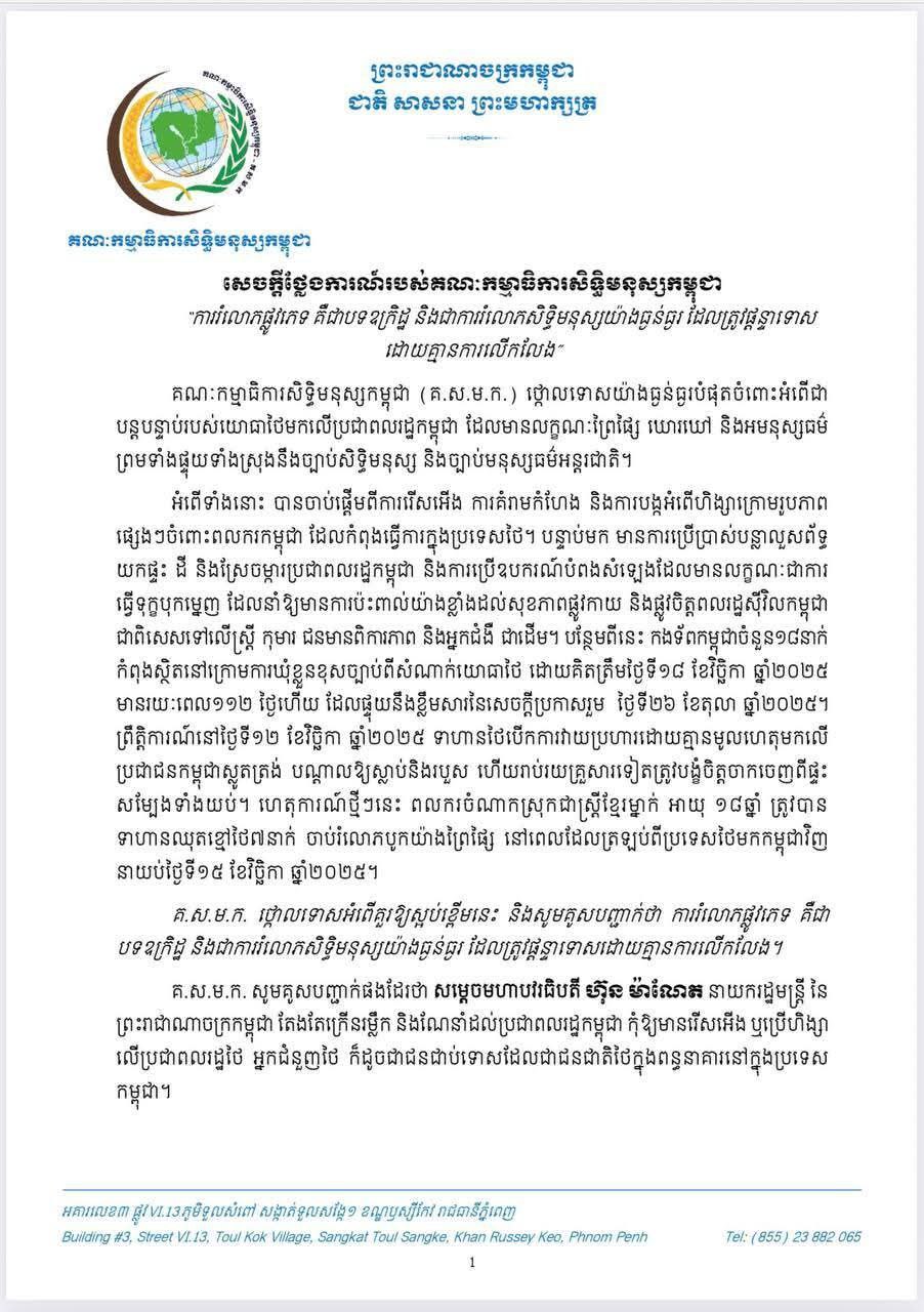 ភ្នំពេញ៖ គណៈកម្មាធិការសិទ្ធិមនុស្សកម្ពុជា (គ.ស.ម.ក.) បានចេញសេចក្តីថ្កោលទោសយ៉ាងខ្លាំង ចំពោះសកម្មភាពហឹង្សា និងអំពើរំលោភសិទ្ធិមនុស្សទាក់ទងនឹងយោធាថៃ ដែលកើតឡើងលើប្រជាពលរដ្ឋ និងពលករកម្ពុជាច្រើនរូប នៅតាមតំបន់ព្រំដែន កម្ពុជា-ថៃ និងក្នុងទឹកដីថៃ។