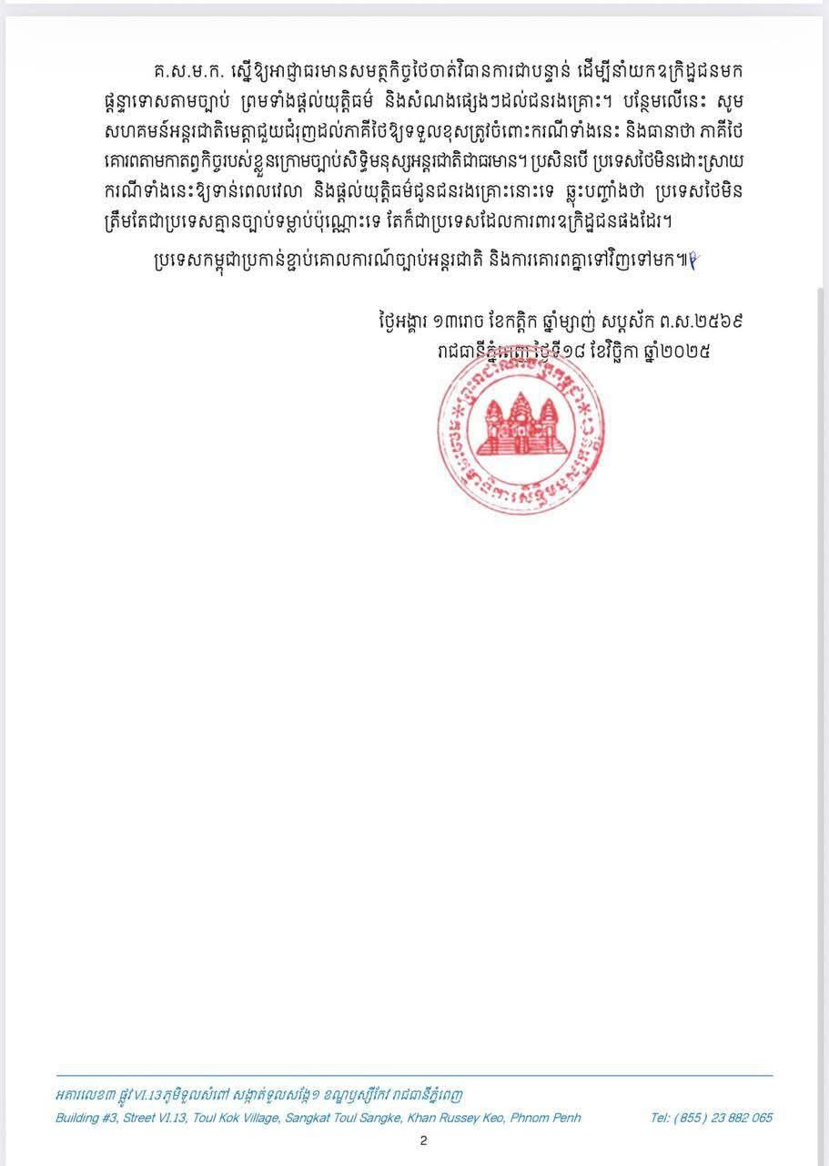 គ.ស.ម.ក អំពាវនាវឱ្យសហគមន៍អន្តរជាតិមេត្តាជួយជំរុញដល់ភាគីថៃឱ្យទទួលខុសត្រូវចំពោះករណីទាំងនេះ និងធានាថា ភាគីថៃ គោរពតាមកាតព្វកិច្ចរបស់ខ្លួនក្រោមច្បាប់សិទ្ធិមនុស្សអន្តរជាតិជាធរមាន។