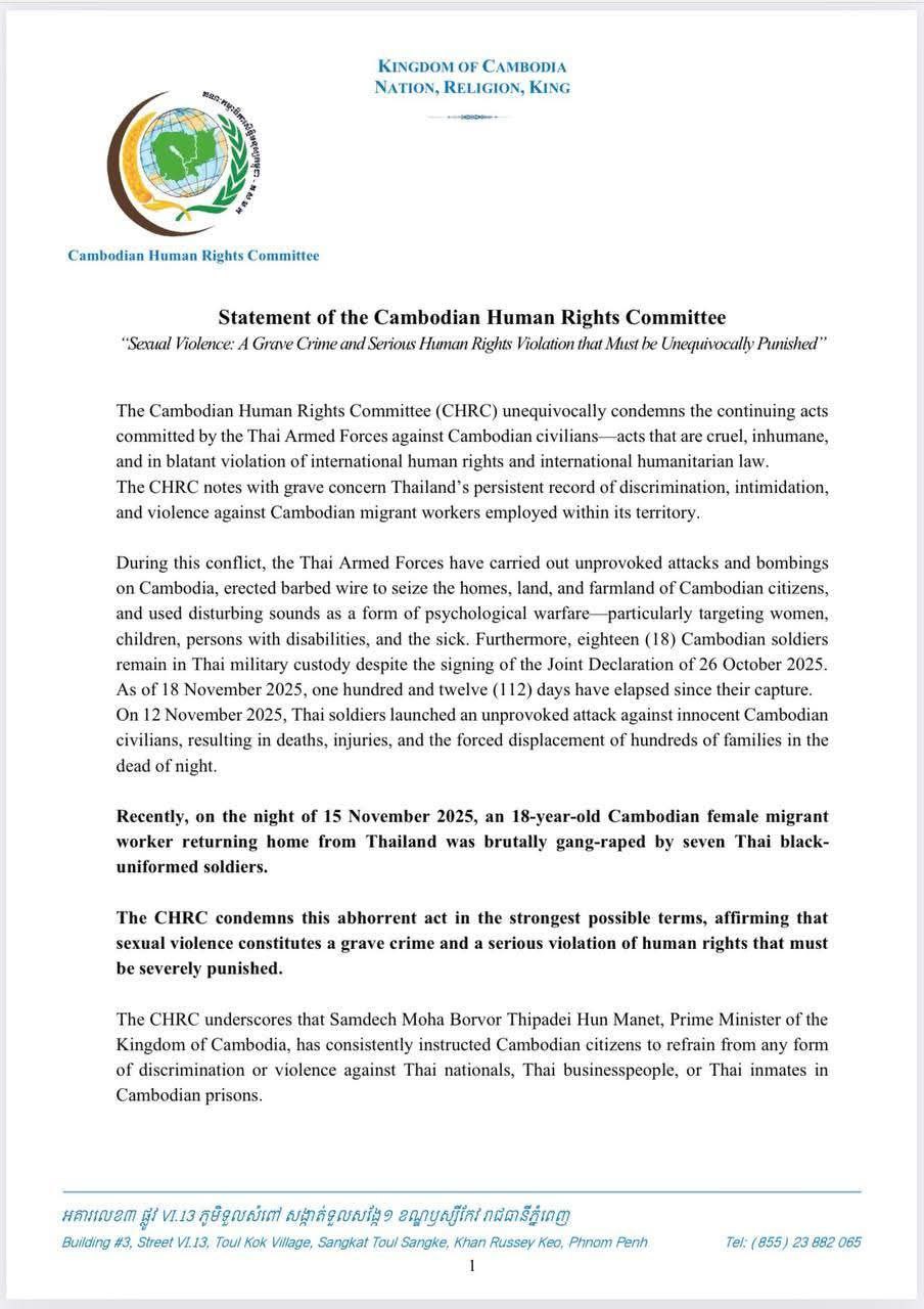 ហេតុការណ៍ថ្មីៗនេះ ពលករចំណាកស្រុកជាស្ត្រីខ្មែរម្នាក់ អាយុ ១៨ឆ្នាំ ត្រូវបានទាហានឈុតខ្មៅថៃ៧នាក់ ចាប់រំលោភបូកយ៉ាងព្រៃផ្សៃ នៅពេលដែលត្រឡប់ពីប្រទេសថៃមកកម្ពុជាវិញ នាយប់ថ្ងៃទី១៥ ខែវិច្ឆិកា ឆ្នាំ២០២៥។