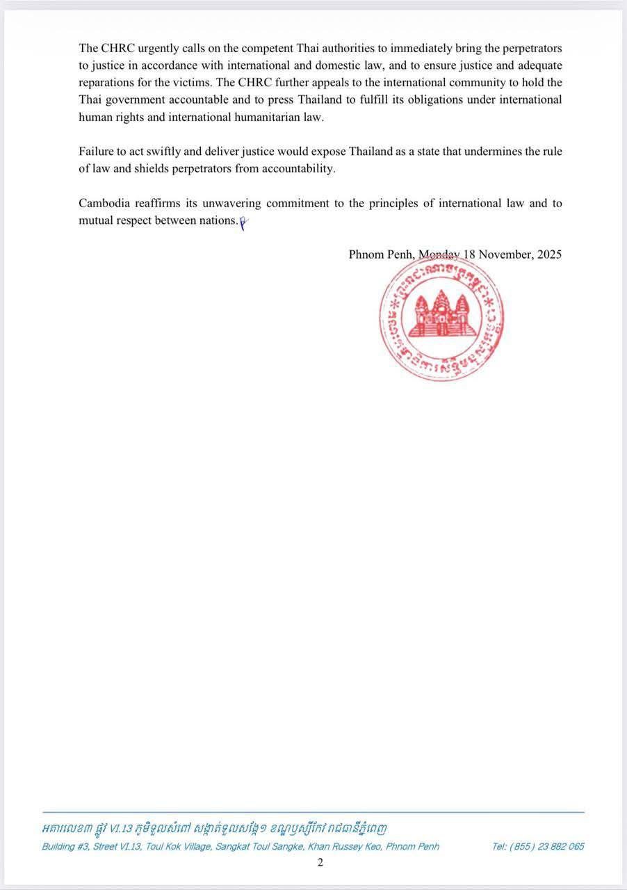 គ.ស.ម.ក. ស្នើឱ្យអាជ្ញាធរមានសមត្ថកិច្ចថៃចាត់វិធានការជាបន្ទាន់ ដើម្បីនាំយកឧក្រិដ្ឋជនមក ផ្តន្ទាទោសតាមច្បាប់ ព្រមទាំងផ្តល់យុត្តិធម៌ និងសំណងផ្សេងៗដល់ជនរងគ្រោះ។