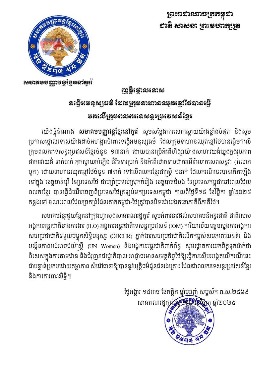 សមាគមខ្មែរនៅកូរ៉េខាងត្បូង បានអំពាវនាវដល់សហគមន៍អន្តរជាតិ ជាពិសេស អង្គការអន្តរជាតិខាងការងារ (ILO) អង្គការអន្តរជាតិទេសន្តរប្រវេសន៍ (IOM) ការិយាល័យឧត្តមស្នងការអង្គការសហប្រជាជាតិទទួលបន្ទុកសិទ្ធិមនុស្ស (OHCHR) ភ្នាក់ងារសហប្រជាជាតិលើកកម្ពស់សមភាពយេនឌ័រ និង បង្កើនភាពអង់អាចដល់ស្ត្រី (UN Women) និងអង្គការអន្តរជាតិពាក់ព័ន្ធ សូមផ្តោតការយកចិត្តទុកដាក់ ជាពិសេស ក្នុងការតាមដាននិងជំរុញរាជរដ្ឋាភិបាល អាជ្ញាធរមានសមត្ថកិច្ចថៃឱ្យធ្វើការស៊ើបអង្កេតលើករណីនេះ ជាបន្ទាន់ប្រកបដោយតម្លាភាព សំដៅធានាឱ្យបាននូវយុត្តិធម៌ជូនជនរងគ្រោះ ដែលជាពលករទេសន្តរប្រវេសន៍ខ្មែរ និងការការពារសិទ្ធិ៕