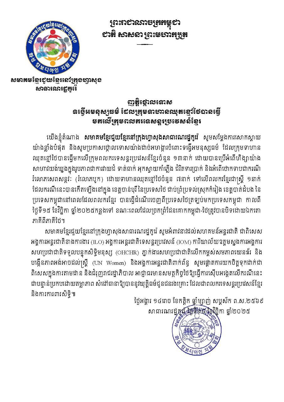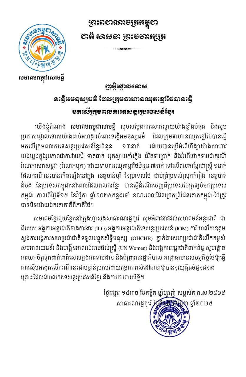 (ភ្នំពេញ)៖ សមាគមខ្មែរចំនួន៦ នៅរ៉េខាងត្បូង នៅថ្ងៃទី១៩ ខែវិច្ឆិកា ឆ្នាំ២០២៥នេះ បានចេញញត្តិដាច់ដោយឡែកពីគ្នាប្រកាសថ្កោលទោសយ៉ាងដាច់អហង្ការចំពោះទង្វើអមនុស្សធម៌ ដែលក្រុមទាហានឈុតខ្មៅថៃបានធ្វើមកលើក្រុមពលករទេសន្តរប្រវេសន៍ខ្មែរចំនួន ១៣នាក់ និងអំពើថោកទាបជាករណីរំលោភសេពសន្ថវៈយ៉ាងព្រៃផ្សៃ។