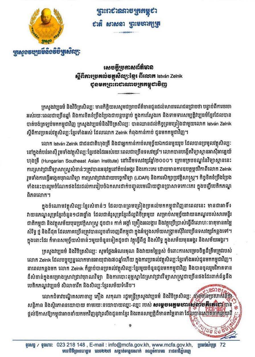 ភ្នំពេញ៖ បន្ទាប់ពីការចរចាអស់រយៈពេលជាច្រើនឆ្នាំ និងការខិតខំប្រឹងប្រែងជាបន្តបន្ទាប់ ក្នុងការស្វែងរក និងទាមទារសម្បត្តិវប្បធម៌ខ្មែរដែលបាន បាត់បង់ត្រឡប់មកកម្ពុជាវិញ ក្រសួងវប្បធម៌និងវិចិត្រសិល្បៈ បានឈានដល់កិច្ចព្រមព្រៀងជាមួយលោក István Zelnik ស្តីពី “ការប្រគល់វត្ថុសិល្បៈខ្មែរ” ទាំងអស់ដែលលោក Zelnik កំពុងកាន់កាប់ ជូនមកកម្ពុជាវិញ។ នេះបើតាមការបញ្ជាក់របស់ ក្រសួងវប្បធម៌ និងវិចិត្រសិល្បៈ នៅថ្ងៃទី២០ ខែវិច្ឆិកានេះ។