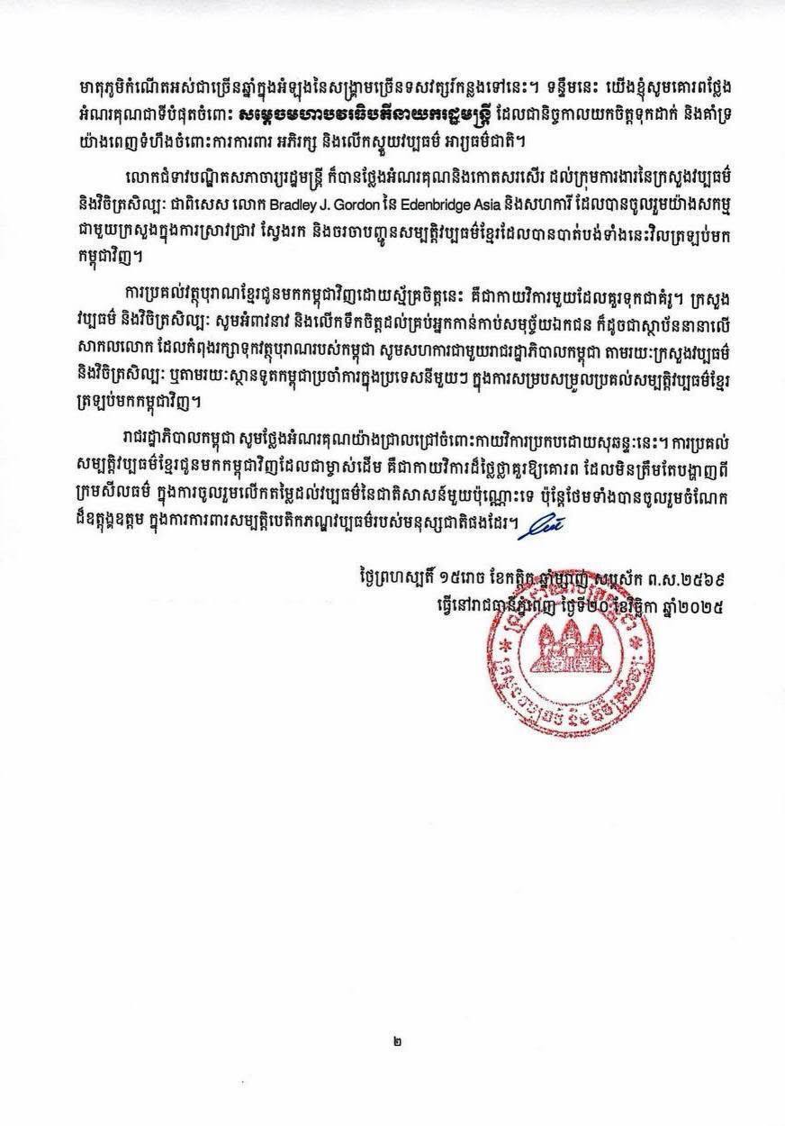 បណ្ឌិតសភាចារ្យរដ្ឋមន្ត្រី ក៏បានថ្លែងអំណរគុណនិងកោតសរសើរ ដល់ក្រុមការងារនៃក្រសួងវប្បធម៌ និងវិចិត្រសិល្បៈ ជាពិសេស លោក Bradley J. Gordon នៃ Edenbridge Asia និងសហការី ដែលបានចូលរួមយ៉ាងសកម្ម ជាមួយក្រសួងក្នុងការស្រាវជ្រាវ ស្វែងរក និងចរចាបញ្ជូនសម្បត្តិវប្បធម៌ខ្មែរដែលបានបាត់បង់ទាំងនេះវិលត្រឡប់មក កម្ពុជាវិញ។