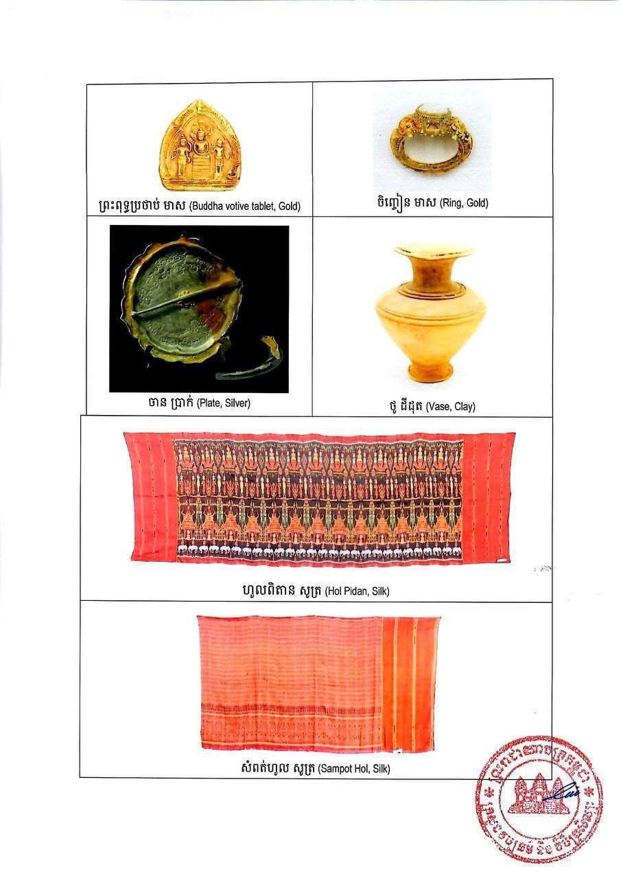 ក្រសួងវប្បធម៌មានឱ្យេដឹងថា ក្នុងចំណោមវត្ថុសិល្បៈខ្មែរសំខាន់ៗ ដែលបានព្រមព្រៀងប្រគល់មកកម្ពុជាវិញនាពេលនេះ មានជាអាទិ៍៖ វាយនភណ្ឌសូត្រខ្មែរ ចំនួន ១៨៣ ផ្ទាំង ដែលជាគំរូសូត្រខ្មែរដ៏ល្អពិចិត្រមួយ សម្រាប់សមុច្ច័យវាយនភណ្ឌរបស់សារមន្ទីរជាតិកម្ពុជា និងវត្ថុសម័យបុរេប្រវត្តិសាស្ត្រ ដូចជា៖ កាក់ អង្កាំ គ្រឿងអលង្ការ និងវត្ថុប្រើប្រាស់ធ្វើពីលោហៈធាតុមានតម្លៃ សំរិទ្ធ ថ្ម និងដីដុត ដែលភាគច្រើនត្រូវបានលួចនាំចេញពីកម្ពុជា ក្នុងអំឡុងសម័យសង្គ្រាមស៊ីវិលច្រើនទសវត្សរ៍កន្លងទៅ។ ក្នុងនោះដែរ ក៏មានសមុច្ច័យសំខាន់ៗមួយចំនួនទៀតដូចជា វត្ថុធ្វើពីថ្ម និងសំរិទ្ធ ក្នុងសម័យមុនអង្គរ និងសម័យអង្គរ។