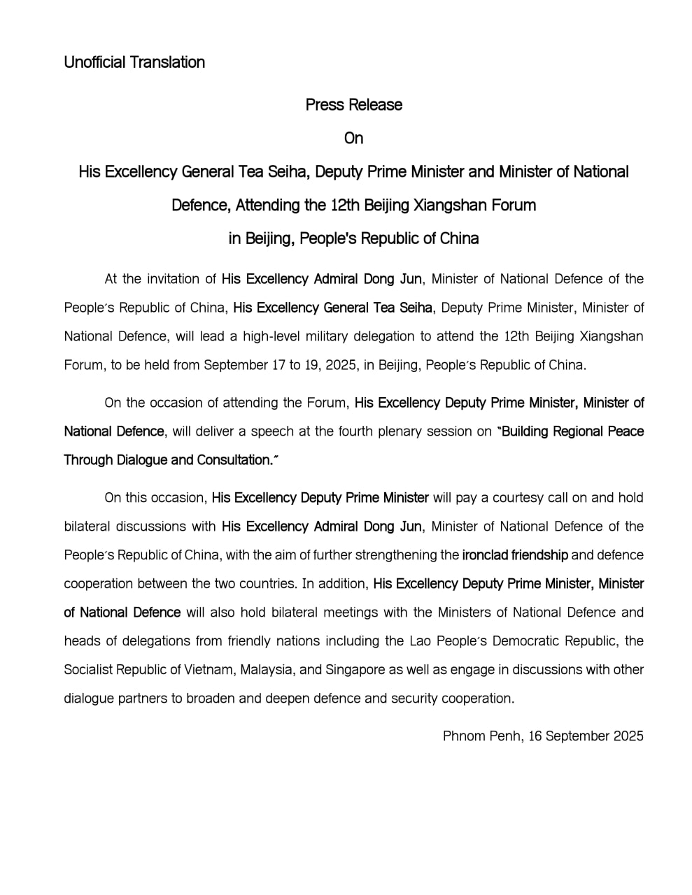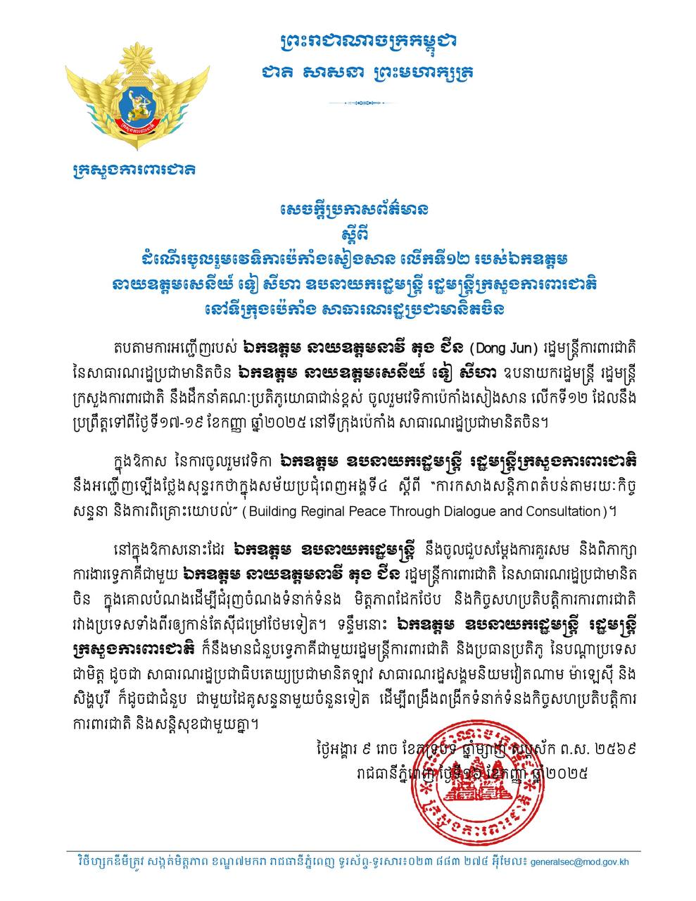 សេចក្តីប្រកាសព័ត៌មាន របស់ក្រសួងការពារជាតិ បានឱ្យដឹងថា តបតាមការអញ្ជើញ របស់ នាយឧត្តមនាវី តុង ជីន (Dong Jun) រដ្ឋមន្ត្រីការពារជាតិ នៃសាធារណរដ្ឋប្រជាមានិតចិន នាយឧត្តមសេនីយ៍ ទៀ សីហា ឧបនាយករដ្ឋមន្ត្រី រដ្ឋមន្ត្រីក្រសួងការពារជាតិ បានដឹកនាំគណៈប្រតិភូយោធាជាន់ខ្ពស់ ចូលរួមវេទិកាប៉េកាំងសៀងសាន លើកទី១២ ដែលនឹងប្រព្រឹត្តទៅពីថ្ងៃទី១៧-១៩ ខែកញ្ញា ឆ្នាំ២០២៥ នៅទីក្រុងប៉េកាំង សាធារណរដ្ឋប្រជាមានិតចិន។