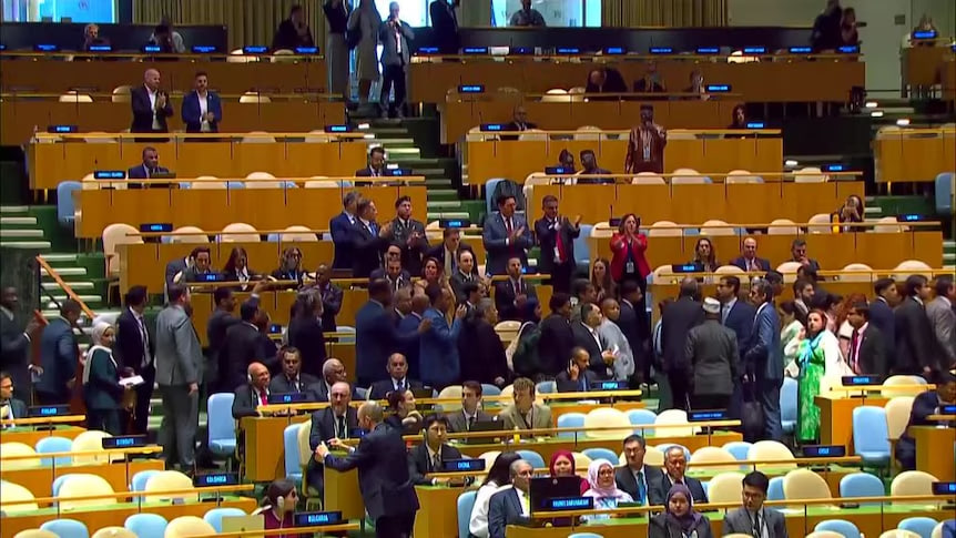 គណៈប្រតិភូជាច្រើននាក់បានដើរចេញពីសាលមហាសន្និបាតអង្គការសហប្រជាជាតិ ខណៈដែលនាយករដ្ឋមន្ត្រីអ៊ីស្រាអែល លោក បេនចាមីន នេតាន់យ៉ាហ៊ូ (Benjamin Netanyahu) ចាប់ផ្ដើមថ្លែងសុន្ទរកថា។