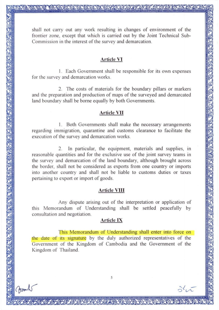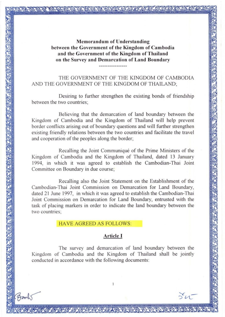 រដ្ឋលេខាធិការក្រសួងយុត្តិធម៌ បានបន្ថែមទៀតថា MOU ឆ្នាំ២០០០ ស្តីពី ការវាស់វែង និងខ័ណ្ឌសីមាព្រំដែនគោក រវាងកម្ពុជា និងថៃ ទោះបីមានឈ្មោះជា MOU ប៉ុន្តែជាកិច្ចព្រមព្រៀងអន្តរជាតិ ដែលមានតម្លៃដូចសន្ធិសញ្ញា, ត្រូវបានចុះបញ្ជីនៅ អ.ស.ប. និងផ្សព្វផ្សាយជាផ្លូវការដោយ អ.ស.ប. ស្របតាមមាត្រា ១០២ នៃធម្មនុញ្ញសហប្រជាជាតិ, មិនមានកាលបរិច្ឆេទផុតកំណត់ និងមិនមានបទប្បញ្ញត្តិចែង ឬបង្កប់ដោយតណ្ហីភាព (Imply) អំពីលទ្ធភាពក្នុងការលុបចោលជាឯកតោភាគី។