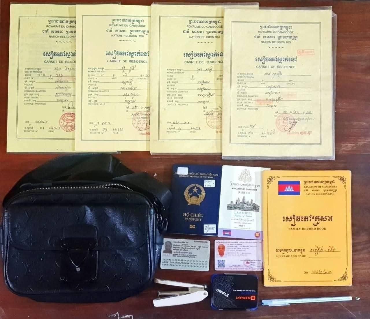 ចំពោះវត្ថុតាងដែលសមត្ថកិច្ចដកហូតបាន រួមមាន៖ សៀវភៅស្នាក់នៅ ០៤ ច្បាប់, សៀវភៅគ្រួសារ ០១ ច្បាប់, អត្តសញ្ញាណប័ណ្ណ ០១ សន្លឹក, ឯកសារកិច្ចសន្យា ០៩ ច្បាប់ ដែលបានសរសេររួច, ប្រដាប់កៀប ១, ប្រាក់ខ្មែរ ចំនួន ៤លានរៀល, ប្រាក់ដុល្លារ ចំនួន ១.៥០០ ដុល្លារ, លិខិតឆ្លងដែន និងឯកសារផ្សេងៗទៀតមួយចំនួន រួមទាំងម៉ូតូ ចំនួន ០២ គ្រឿង និងទូរសព្ទដៃ ចំនួន ០៤ គ្រឿង។