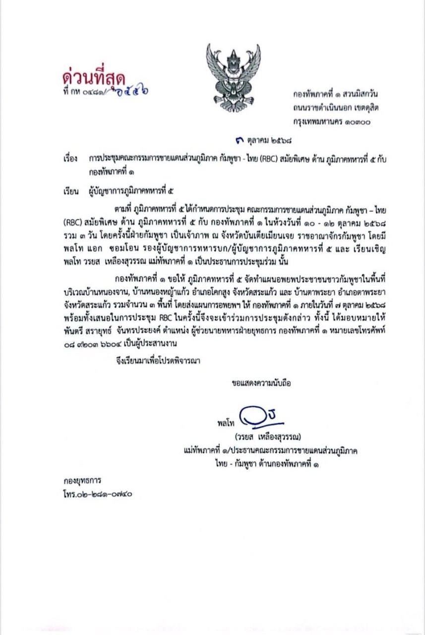 កាលពីថ្ងៃទី៣០ ខែកញ្ញា ឆ្នាំ២០២៥ កន្លងទៅ អ្នកនាំពាក្យក្រសួងការពារជាតិកម្ពុជា លោកស្រីឧត្តមសេនីយ៍ឯក ម៉ាលី សុជាតា បានឱ្យដឹងថា កិច្ចប្រជុំគណៈកម្មាធិការព្រំដែនថ្នាក់យោធភូមិភាគកម្ពុជា-ថៃ (RBC) រវាងយោធភូមិភាគទី៥ នៃព្រះរាជាណាចក្រកម្ពុជា និងកងទ័ពភូមិភាគទី១ នៃព្រះរាជាណាចក្រថៃ ដែលគ្រោងនឹងរៀបចំធ្វើនៅថ្ងៃទី១០ ដល់ថ្ងៃទី១២ ខែតុលា ឆ្នាំ២០២៥ នៅខេត្តបន្ទាយមានជ័យ ដែលកម្ពុជានឹងធ្វើជាម្ចាស់ផ្ទះ។